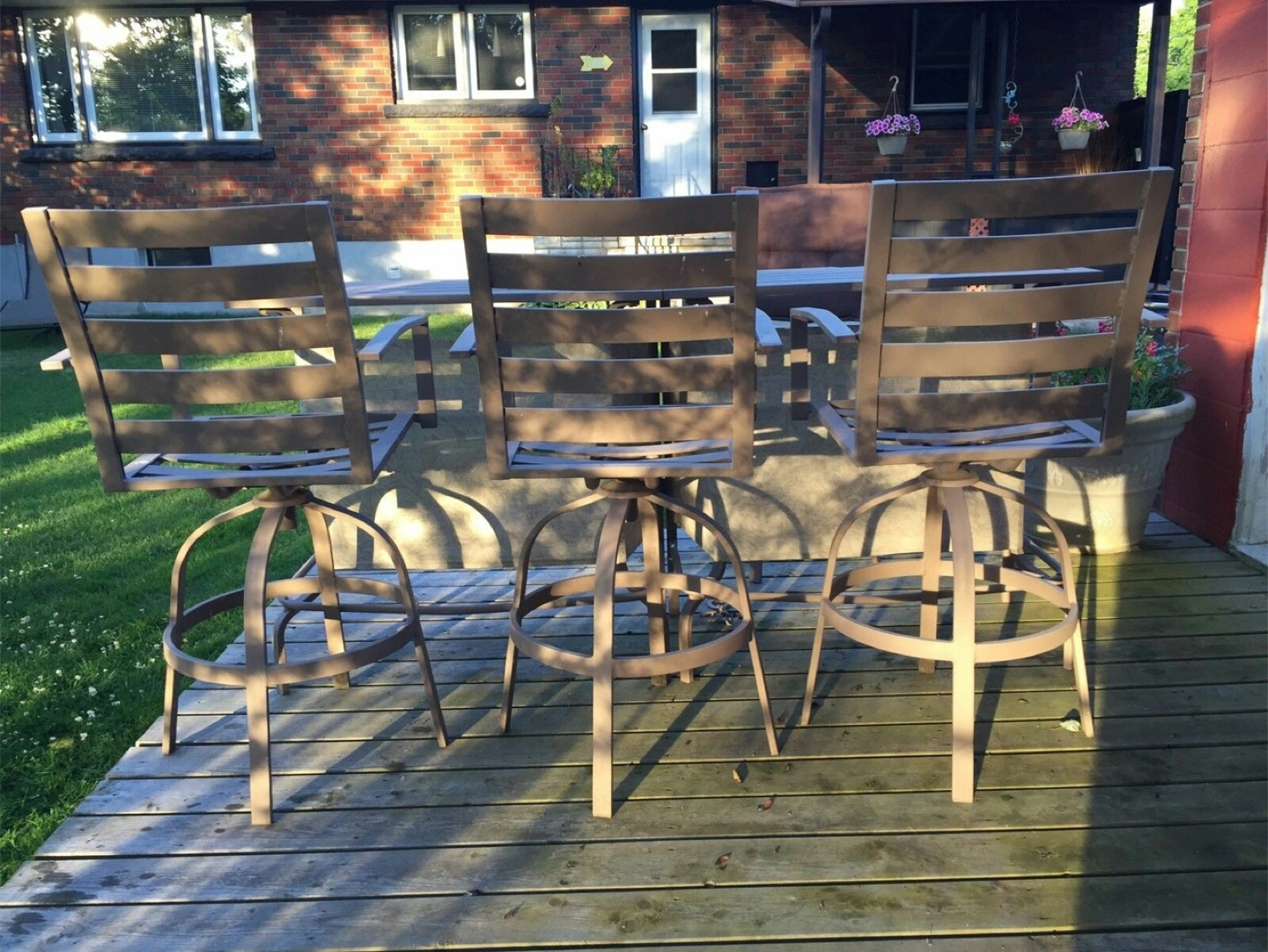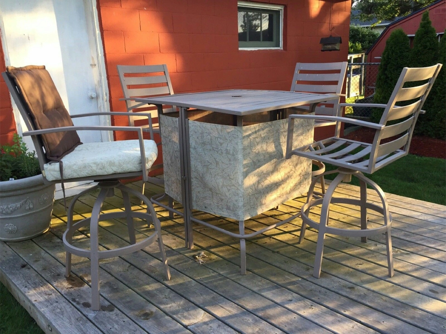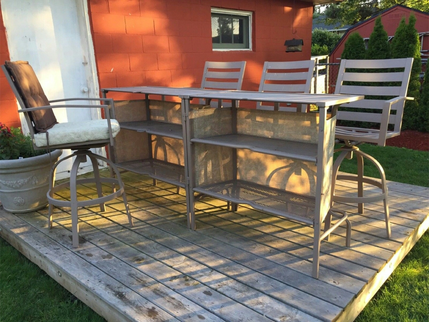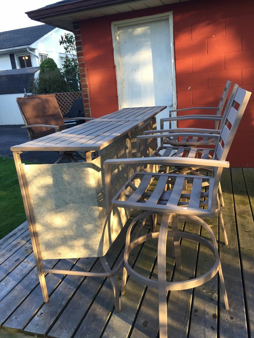 Metal outdoor patio bar set. Includes 4 swivel bar stools. Durable metal frame. Neutral colour. Some wear and tear expected from use. Table can be closed and turns into square table or opened up into bar table.
