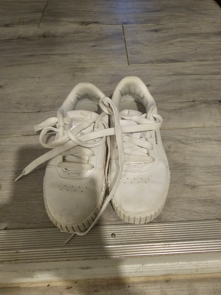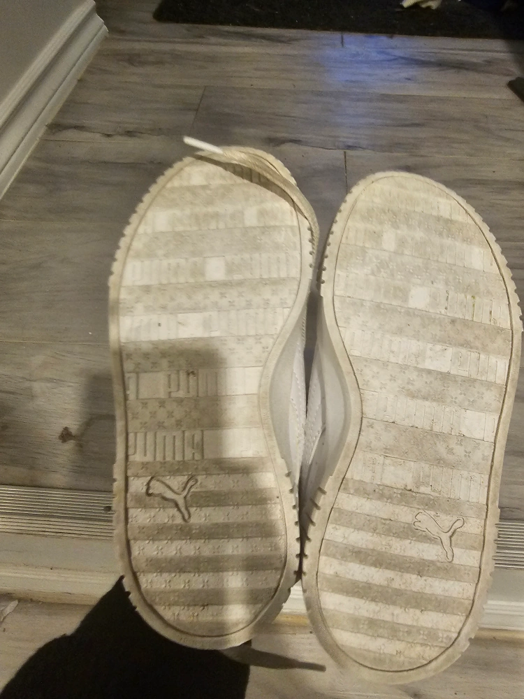 Pre-owned women's Puma sneakers. White leather upper. Lace-up closure. Slightly worn. Good for casual wear. size 13c