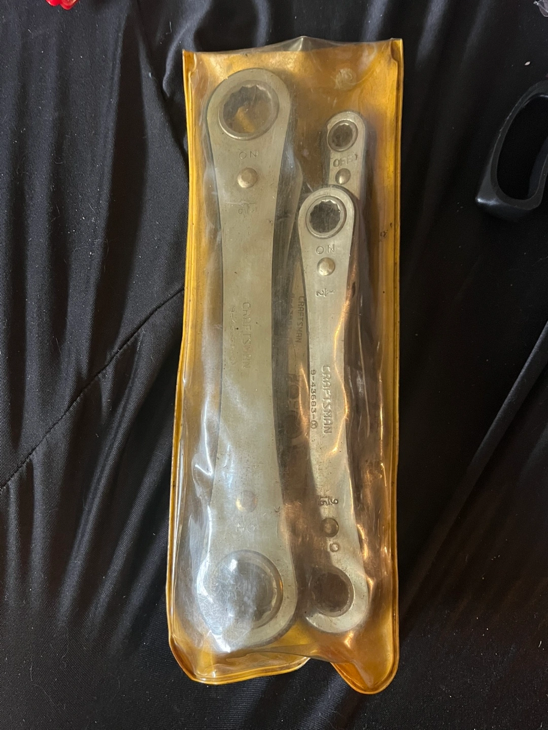 Vintage 5-piece box end ratchet wrench set. Sizes include 1/4 x 5/16, 1/2 x 9/16, 13/16 x 7/8. Dimensions: 3/8 x 7/16, 5/8 x 3/4. Made in the USA. Sold by Sears.