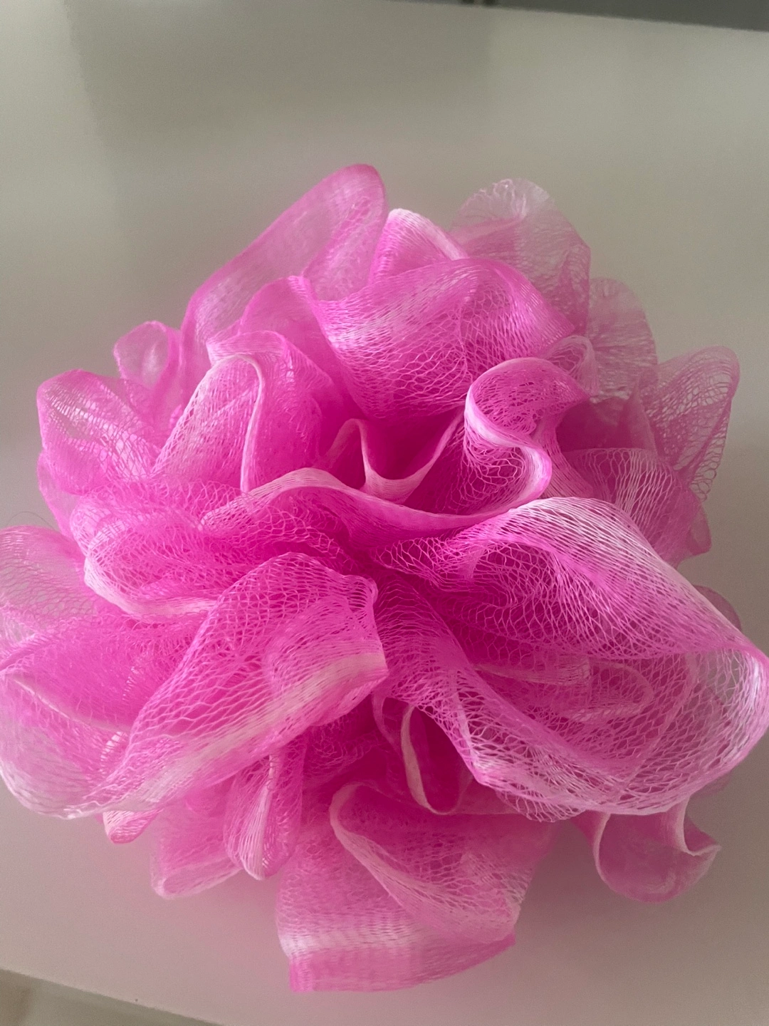used pink and white mesh shower pouf. Soft and gentle exfoliating texture. Convenient hanging loop.
