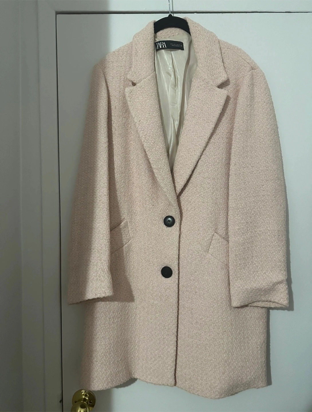 Beautiful pink tweed coat. Size Large. Long sleeves, two pockets, and button closure. Excellent condition. Cash only