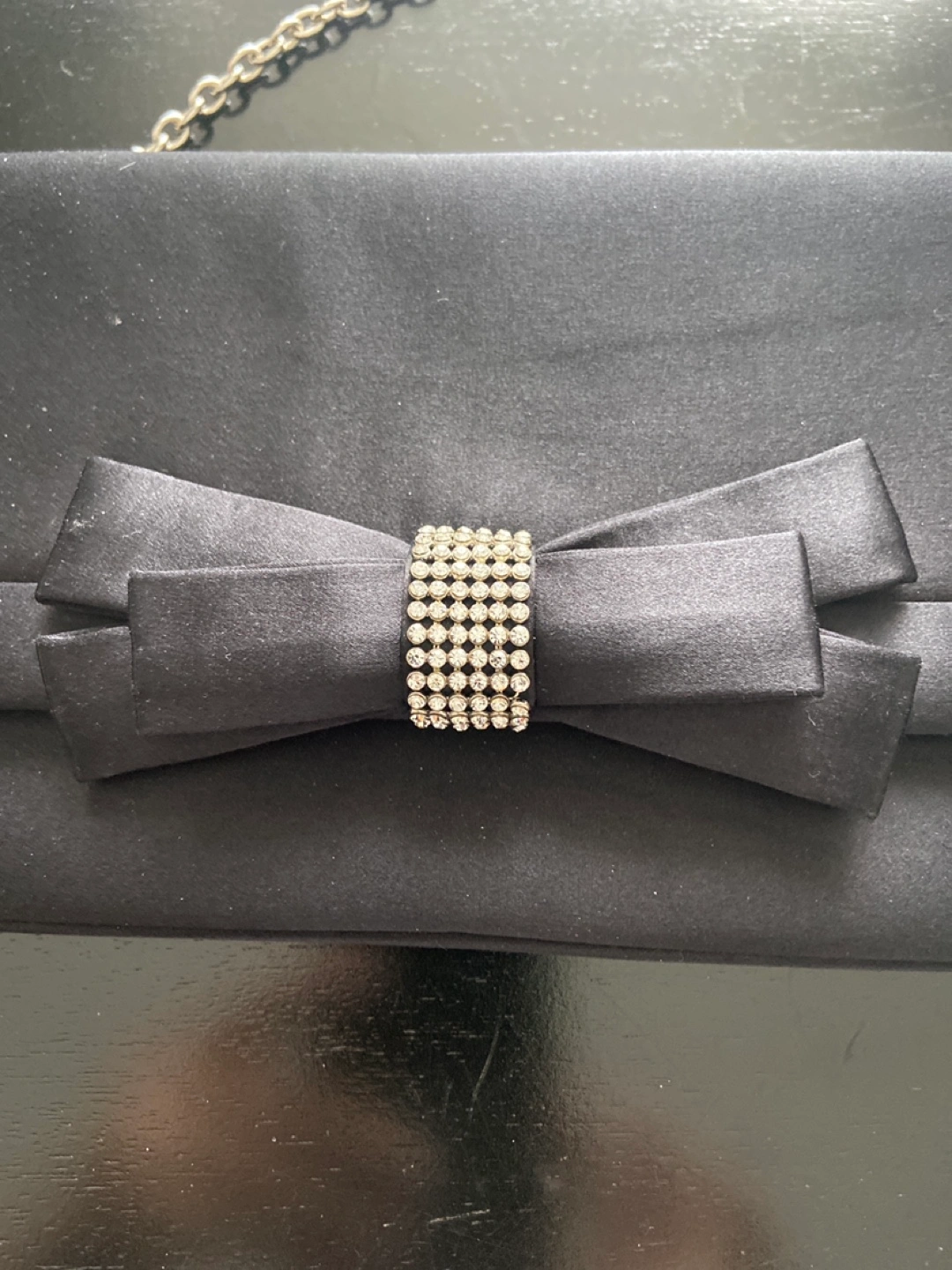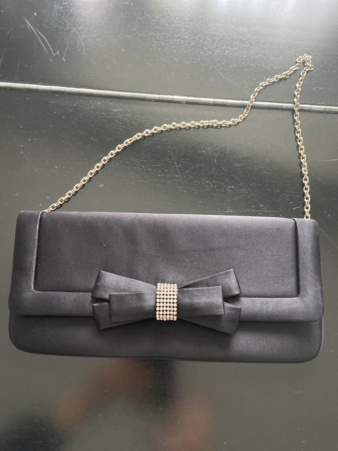 Elegant black satin clutch. Features a rhinestone embellished bow. Silver chain strap. Perfect for special occasions.