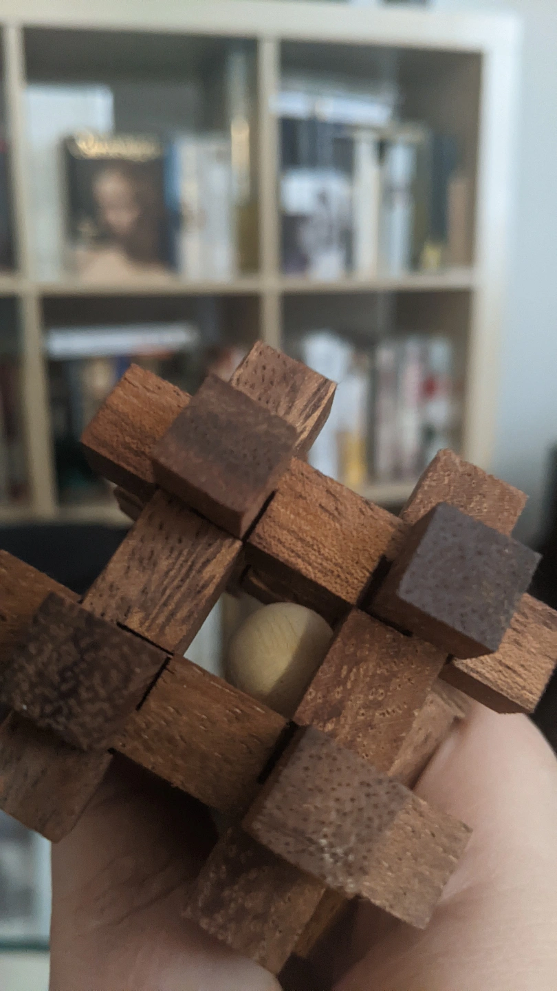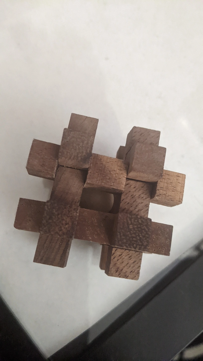 Intricate wooden puzzle. Small size, portable. Wooden blocks interlock. Great for brain training. A challenging and fun game. Pick up at 357 Rusholme Rd.