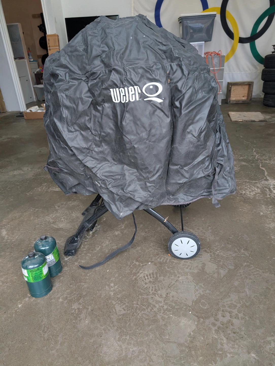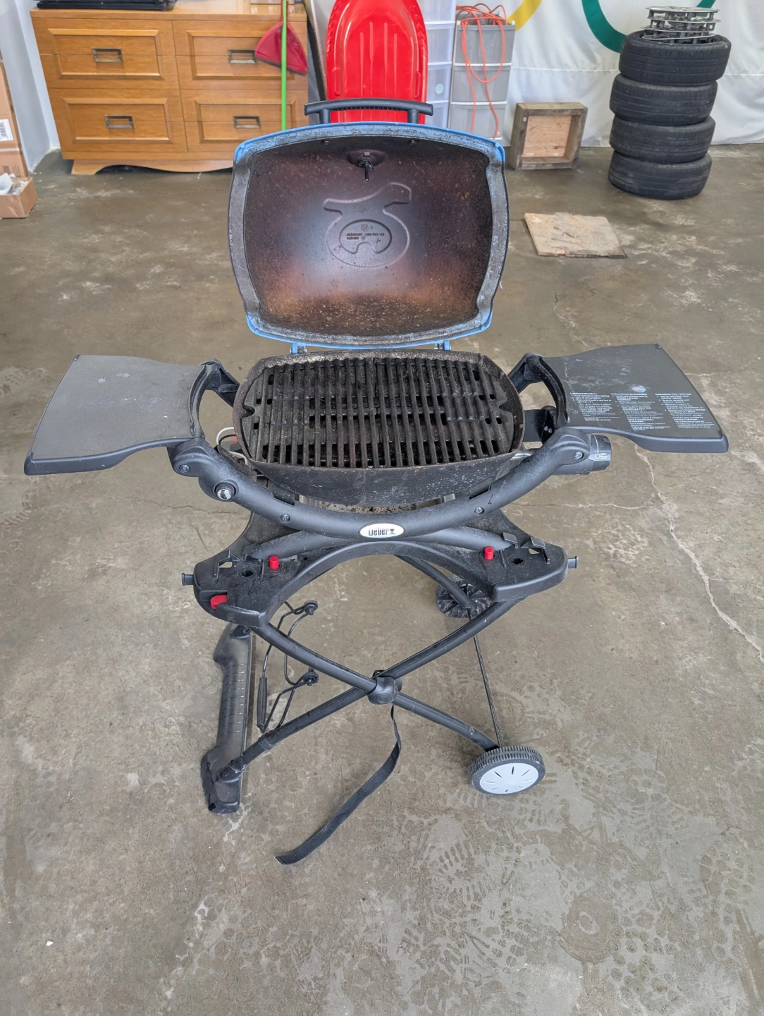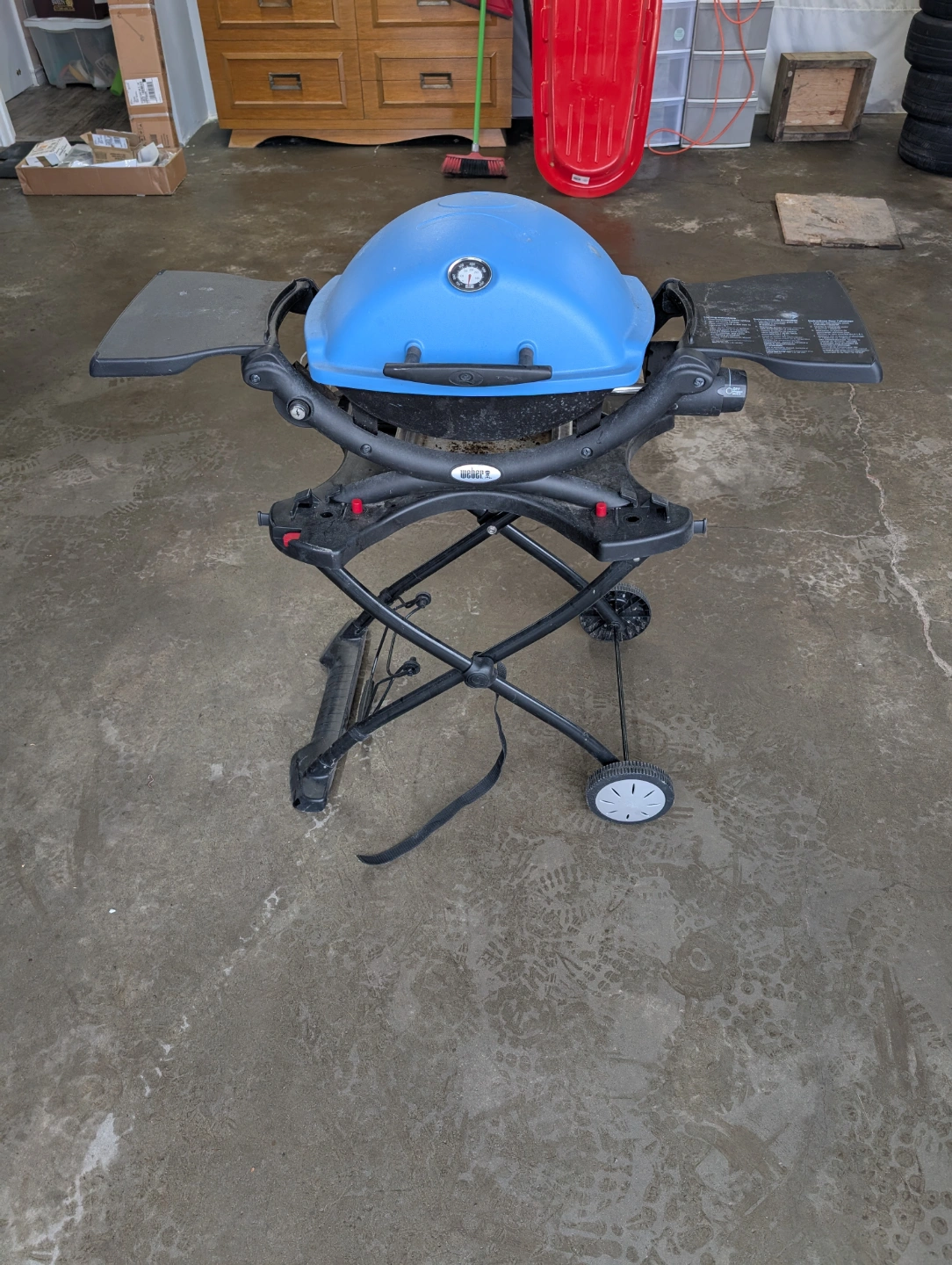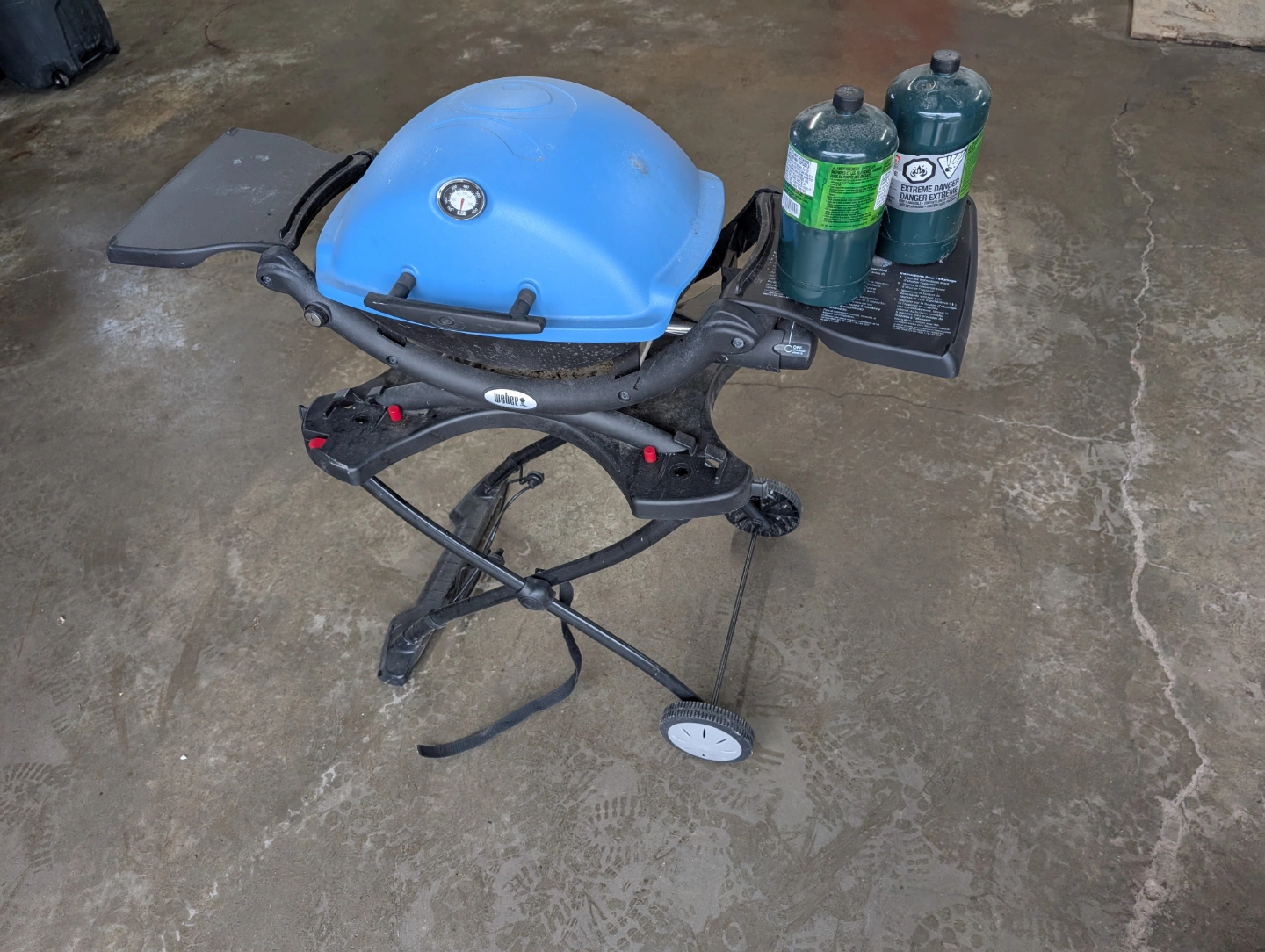 Portable propane gas grill. Blue lid, black frame. Folding stand with wheels and BBQ cover. Two propane tanks included. Shows some signs of use.