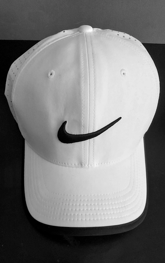 White Nike Dri-Fit cap. Features a black swoosh logo. Breathable design. Adjustable sizing.