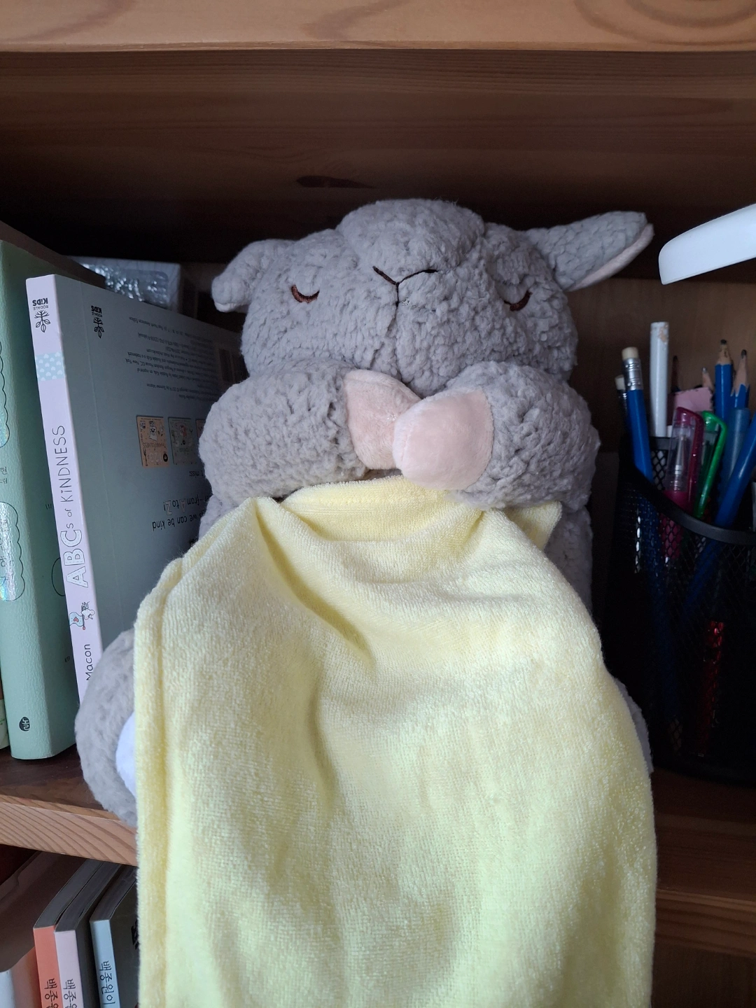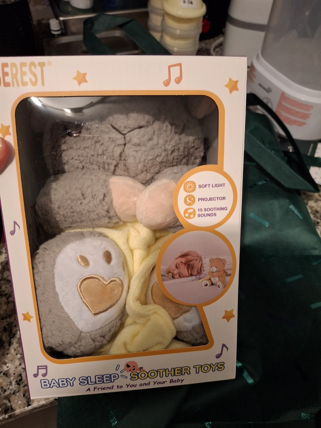 Adorable grey lamb plush toy. Features soft light, projector, and 15 soothing sounds. Perfect for comforting your little one. Comes with a yellow blanket.