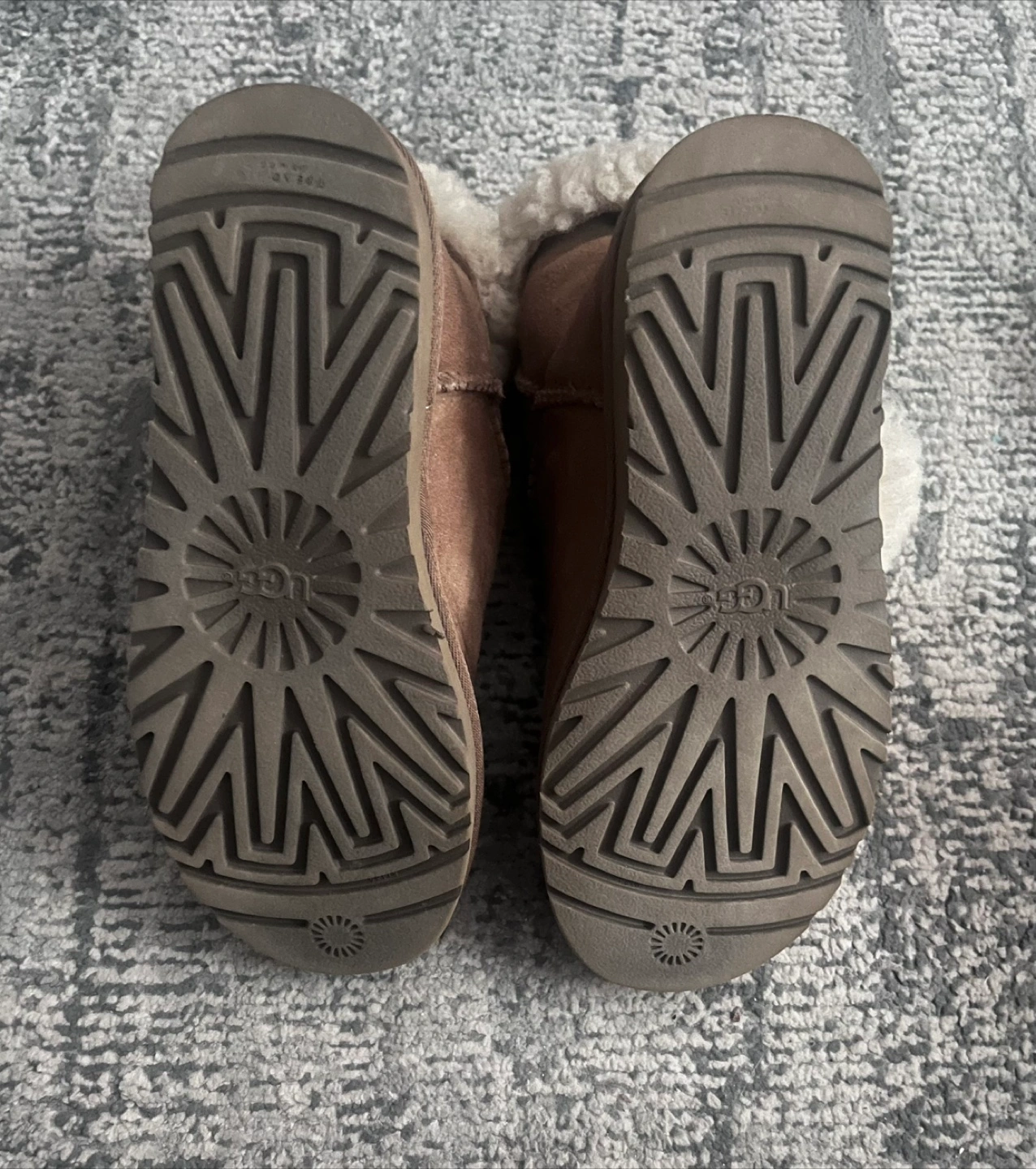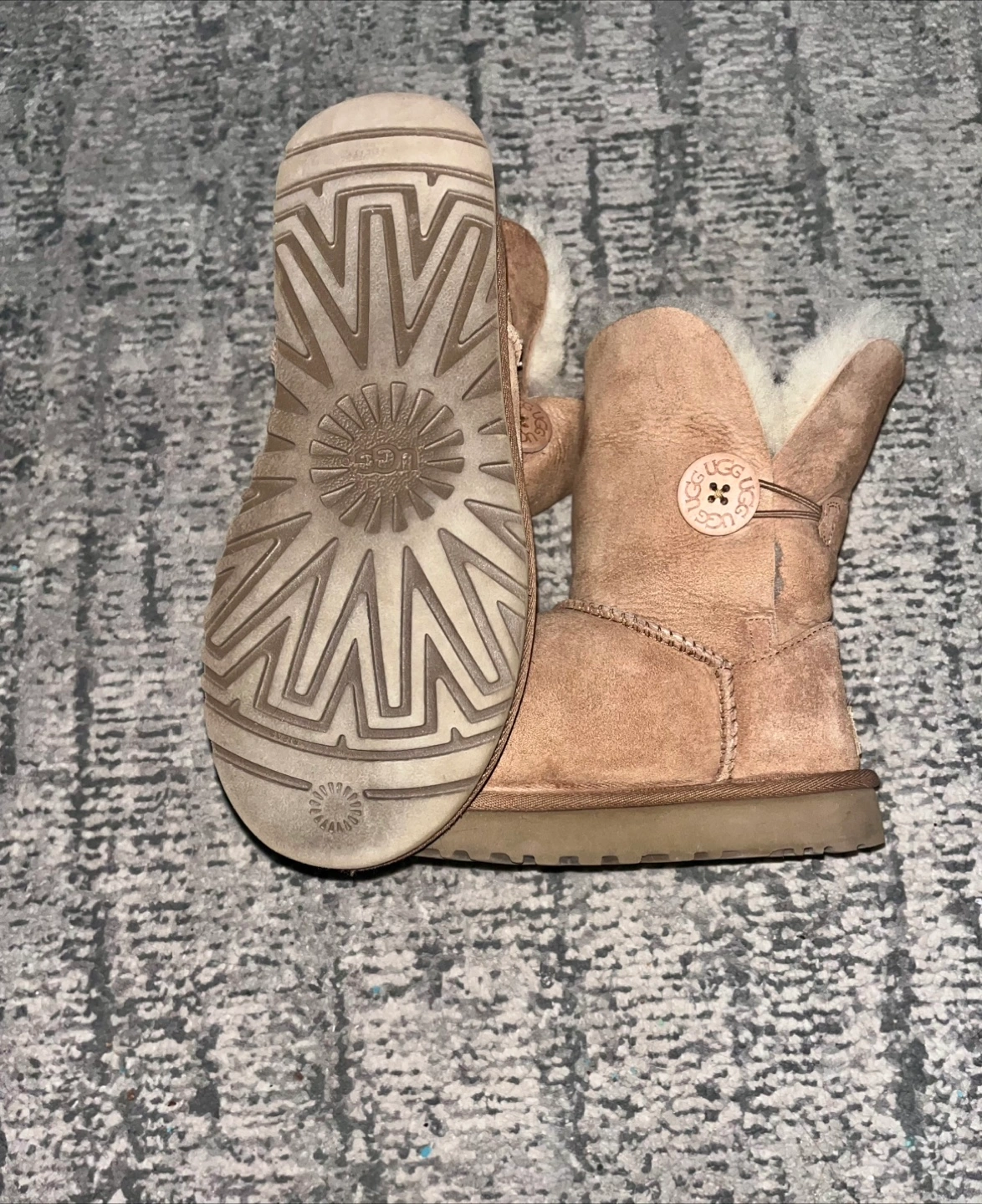 Adorable UGG boots. Size 5. Brown suede exterior, fluffy sheepskin interior. Made in China. Pre-owned.