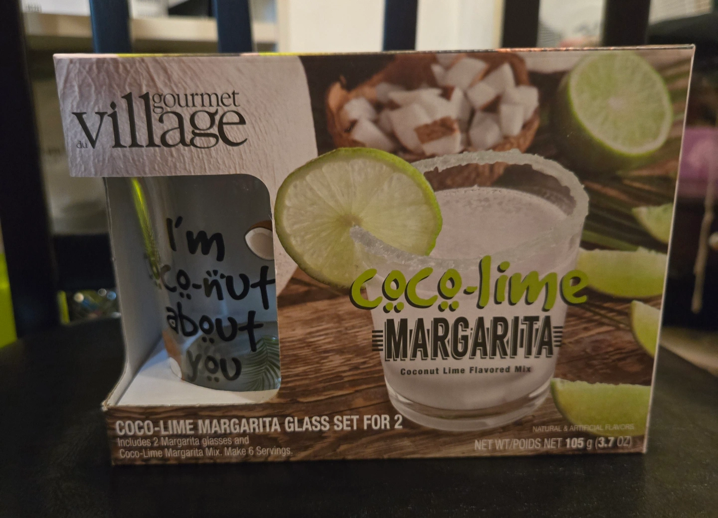Gift set includes two stemless margarita glasses with Coco-Lime Margarita mix included, enough for 6 servings. Features coconuts & palm decal with 2 unique expressions: “I’m Coco-Nuts About You” and “Margarita Kinda Day”. Makes 6 servings. 105 g (3.7 oz) HAND WASHING RECOMMENDED 3 Sets Available