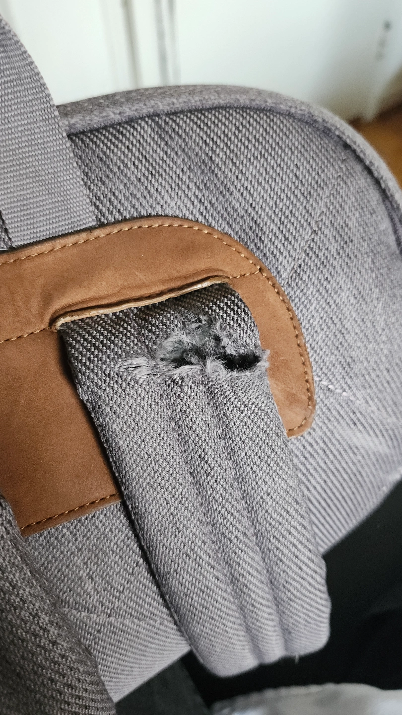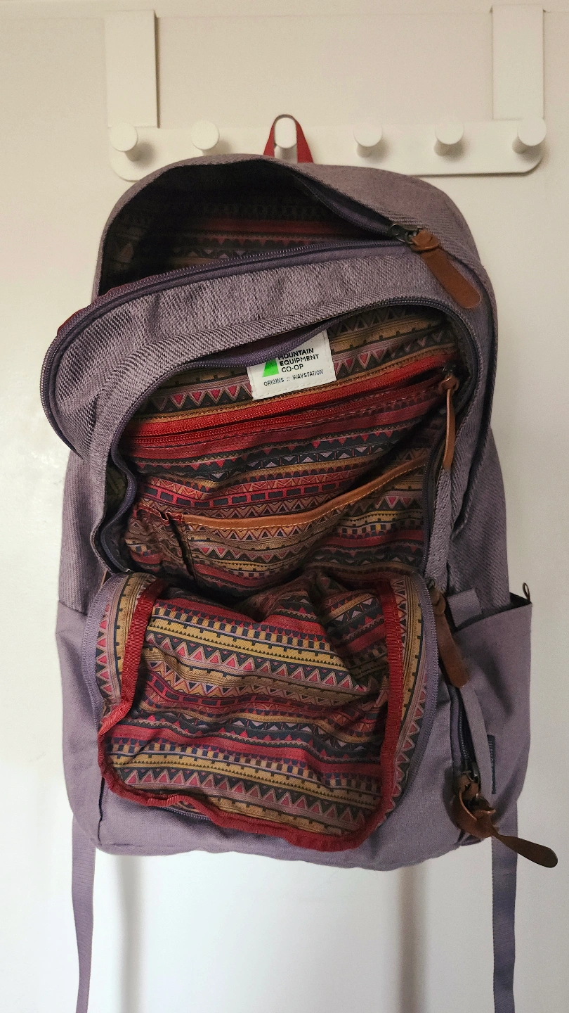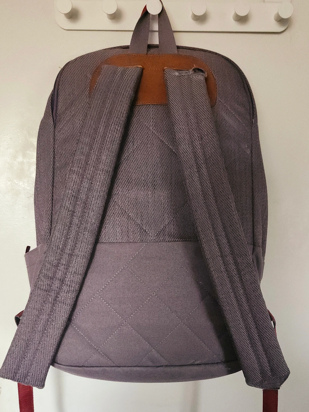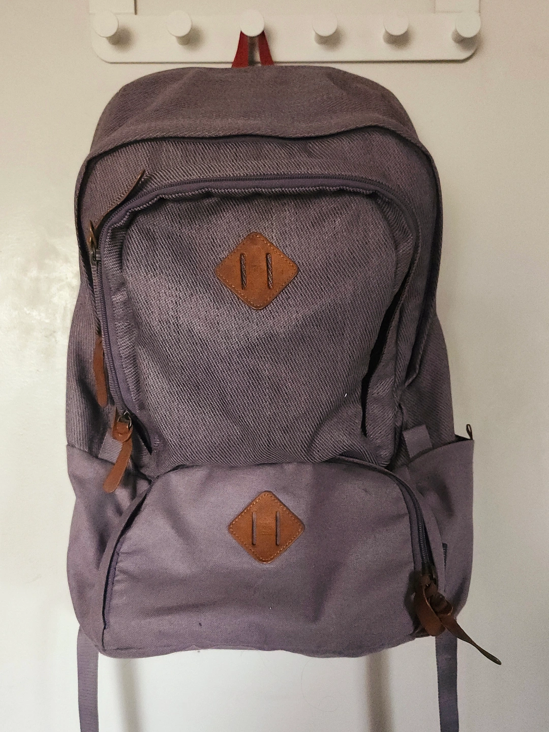 Grey-purple backpack. Has multiple compartments including laptop protector. There's some wear and tear on one of the straps