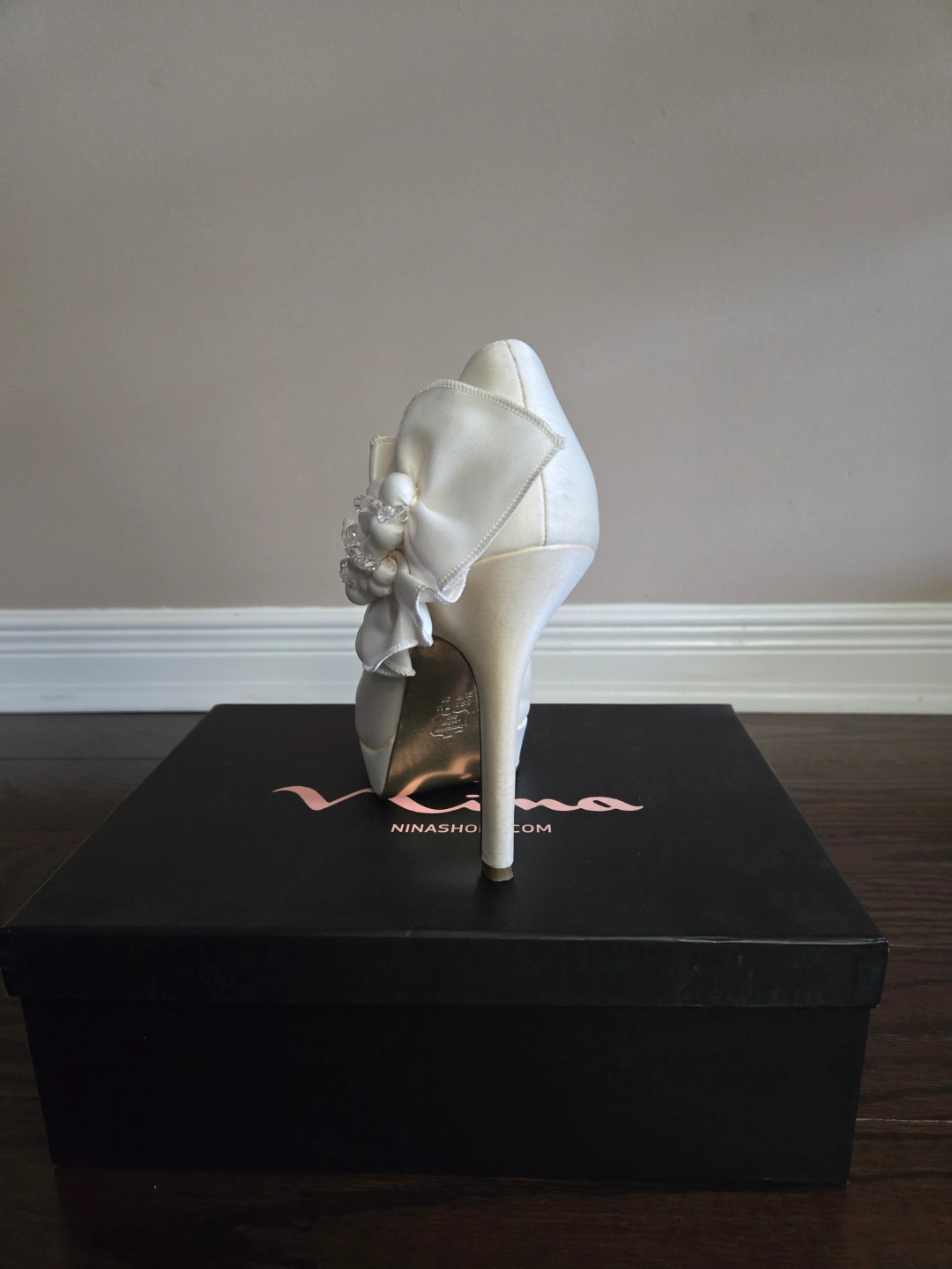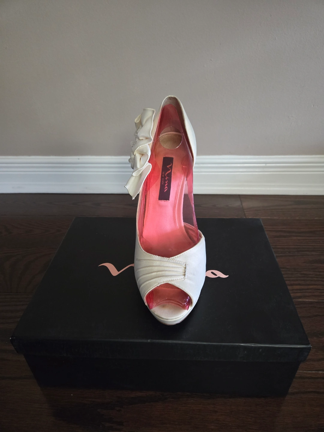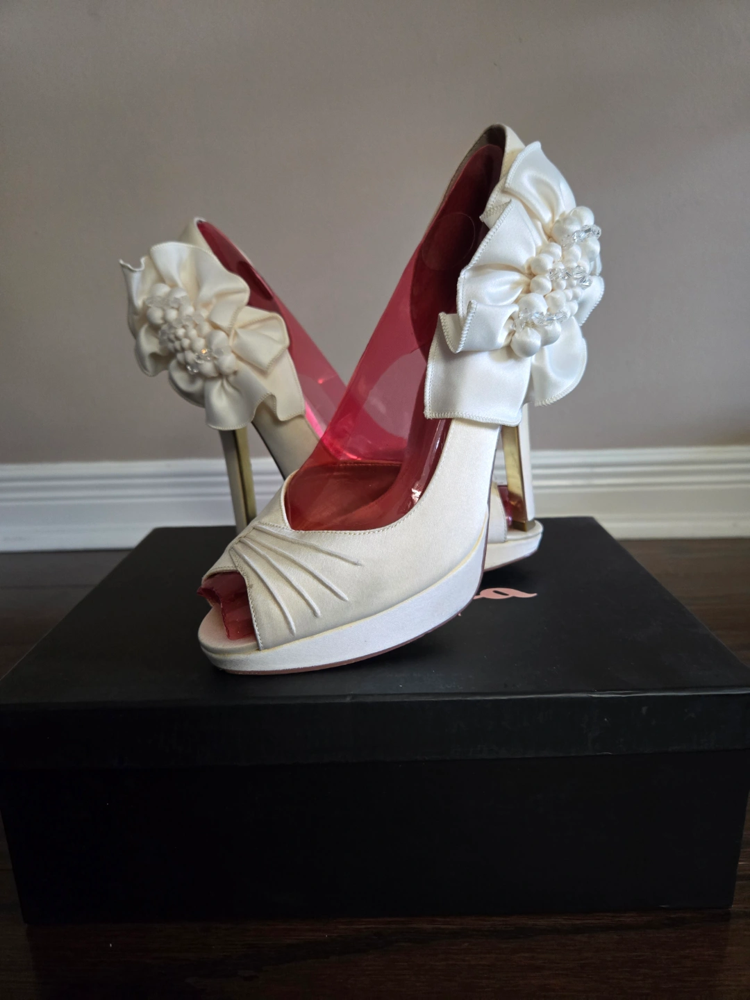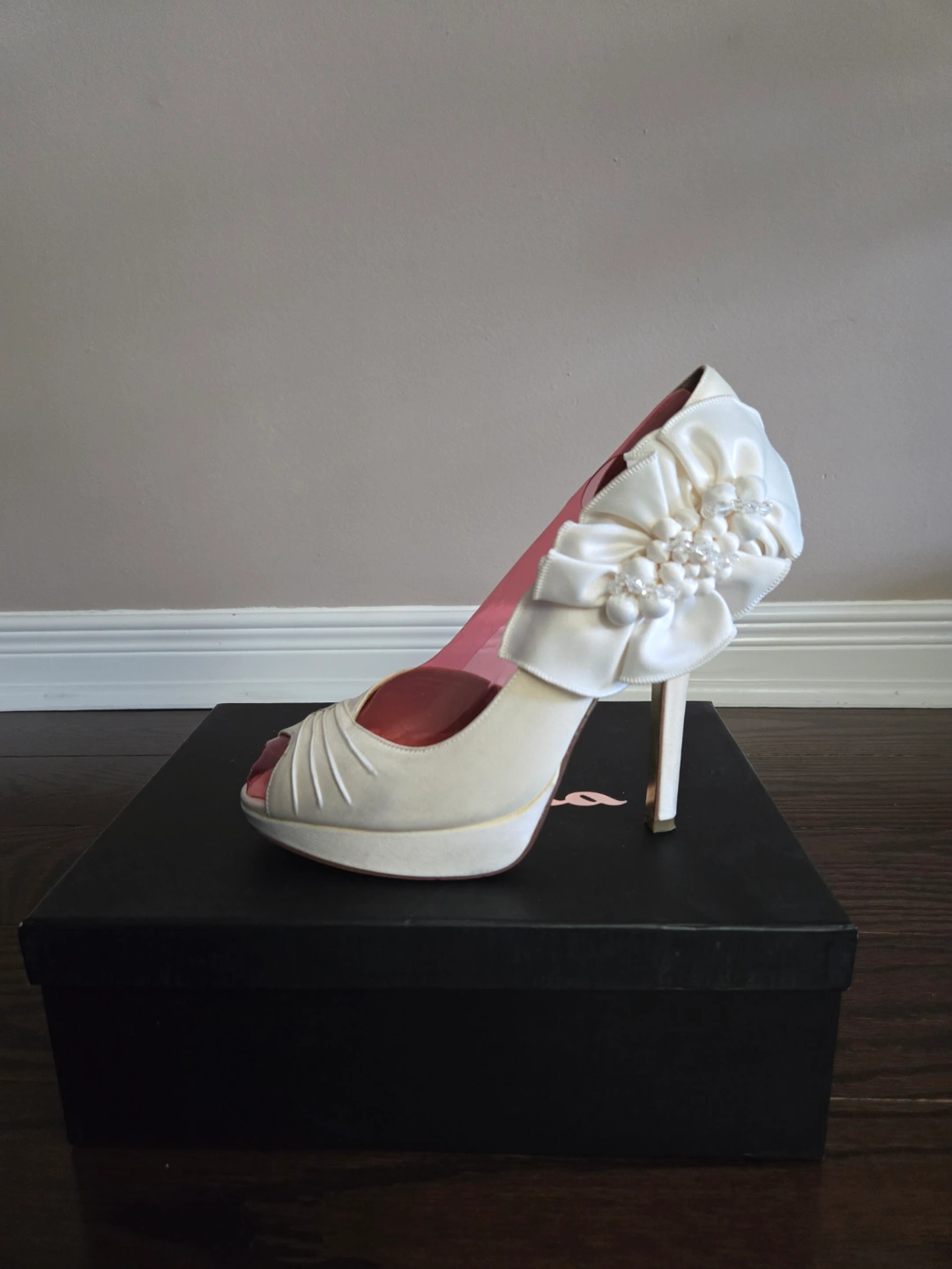 Beautiful ivory satin peep-toe heels. Features a large satin flower accent with pearl detailing. 12 cm high stiletto heel. Size: USA 7 M / EUR 37 Worn once for the wedding. In good condition, just need some cleaning. Comes in original box. Pick up from Richmond Hill.