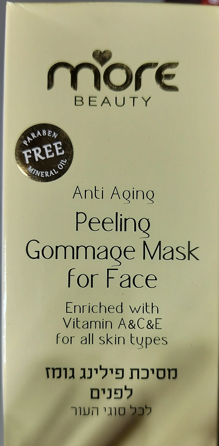 Anti-aging peeling gommage mask for face. Enriched with Vitamin A, C, and E. Suitable for all skin types. Paraben and mineral oil free.