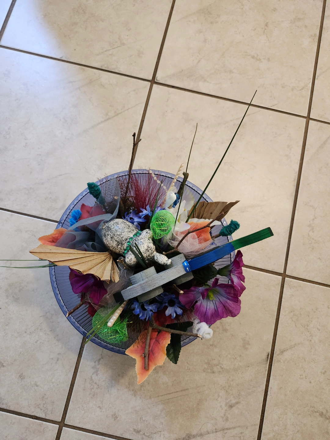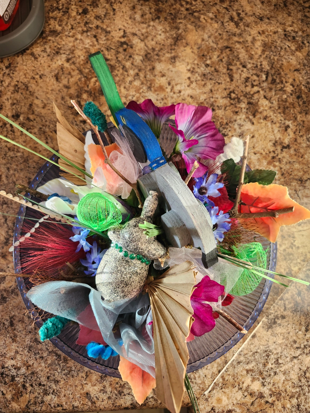 Beautiful and colourful centerpiece. Features artificial flowers, decorative elements, and a charming elephant figurines. Arranged in a clear blue bowl. Perfect for adding a touch of whimsy to any room. Lovely for Mother's day. Cash and pick up only please.