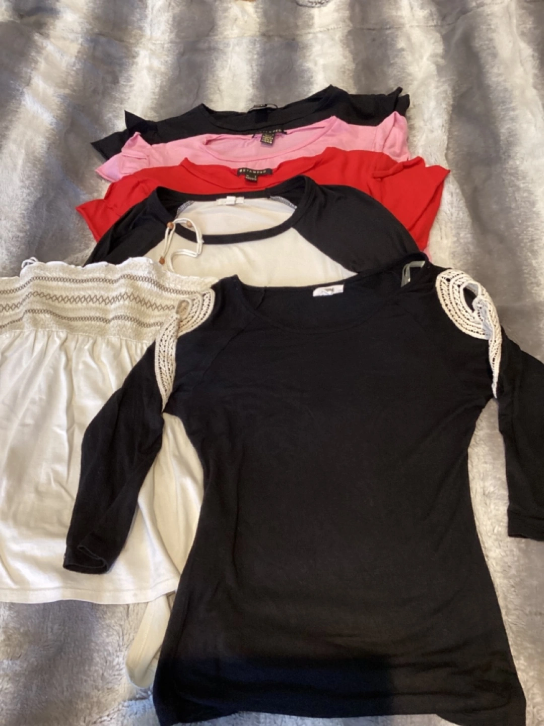 Bundle of 6 Young Teen Tops, selling “as is”, some signs of wear and minor stains, $8 or best offer. Revamped Tops Chest 34” Shirred Top Chest 28” Ardene Top 31 1/2” Ardene Cold Shoulder Top 29 1/2”