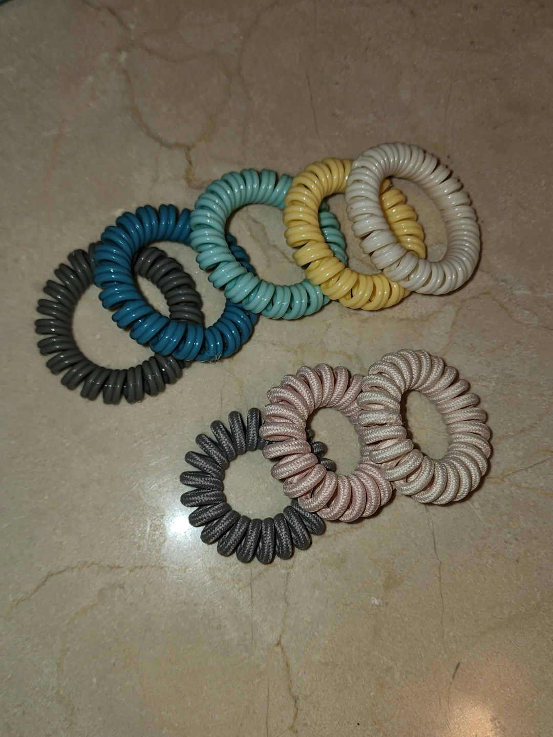 1st set is plastic (5pc) and the 2nd set is cloth/fabric (3pc). Never used because I have thick hair and these don't stretch out enough for me!! Better suited for straight or light weighted hair. Bundle with other items 💕 Pick up at Sheppard West subway station and cash only please :)