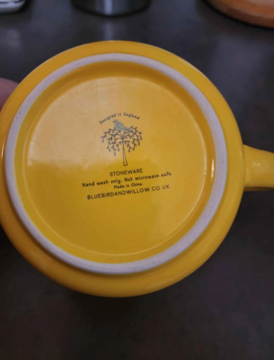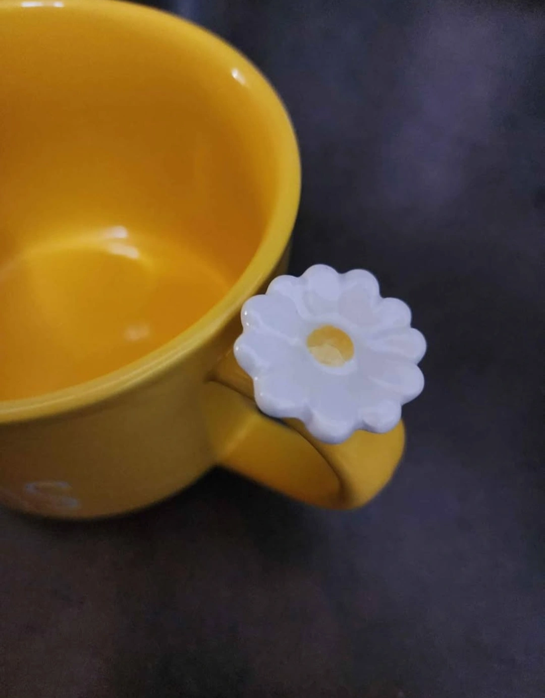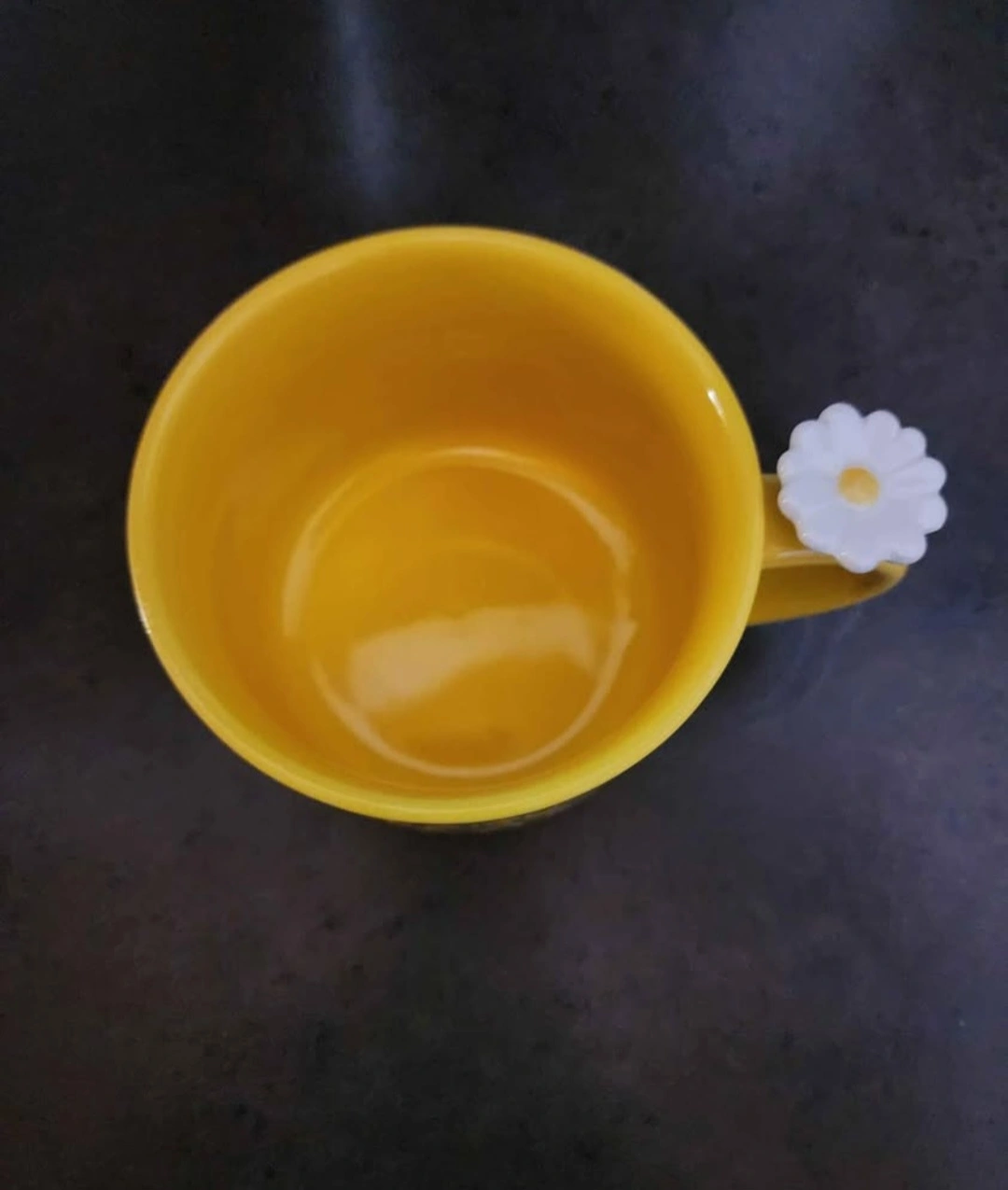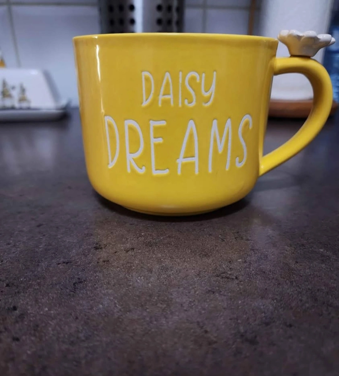Yellow stoneware mug. Daisy design on handle. 'Daisy Dreams' text on mug. Only used for decoration. Pick up in Shaganappi sw.