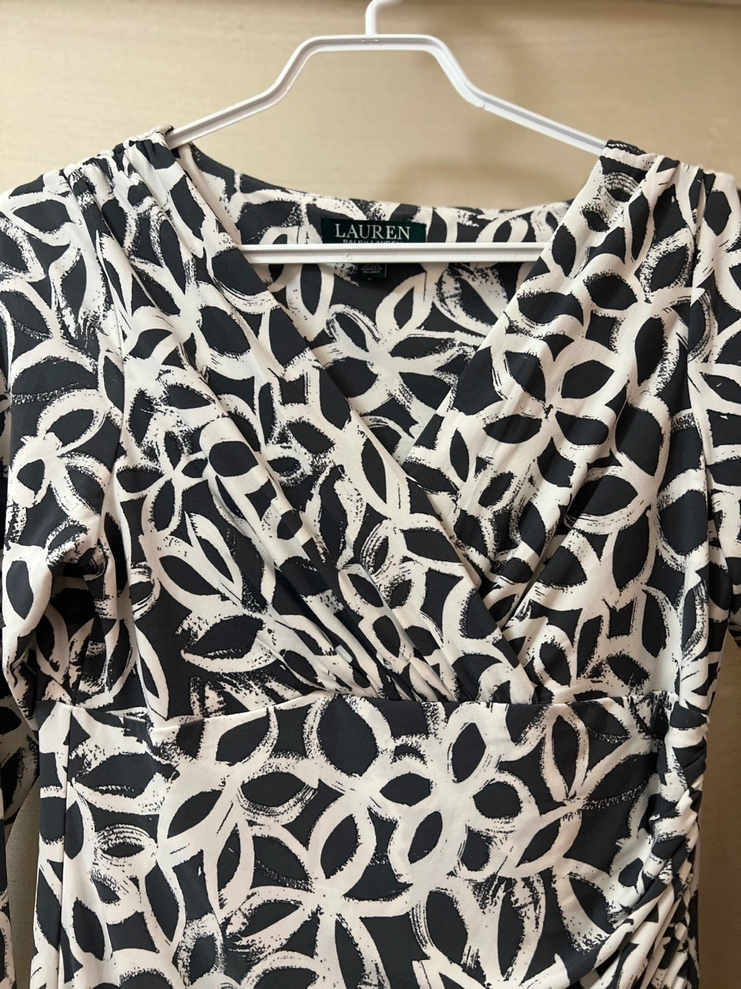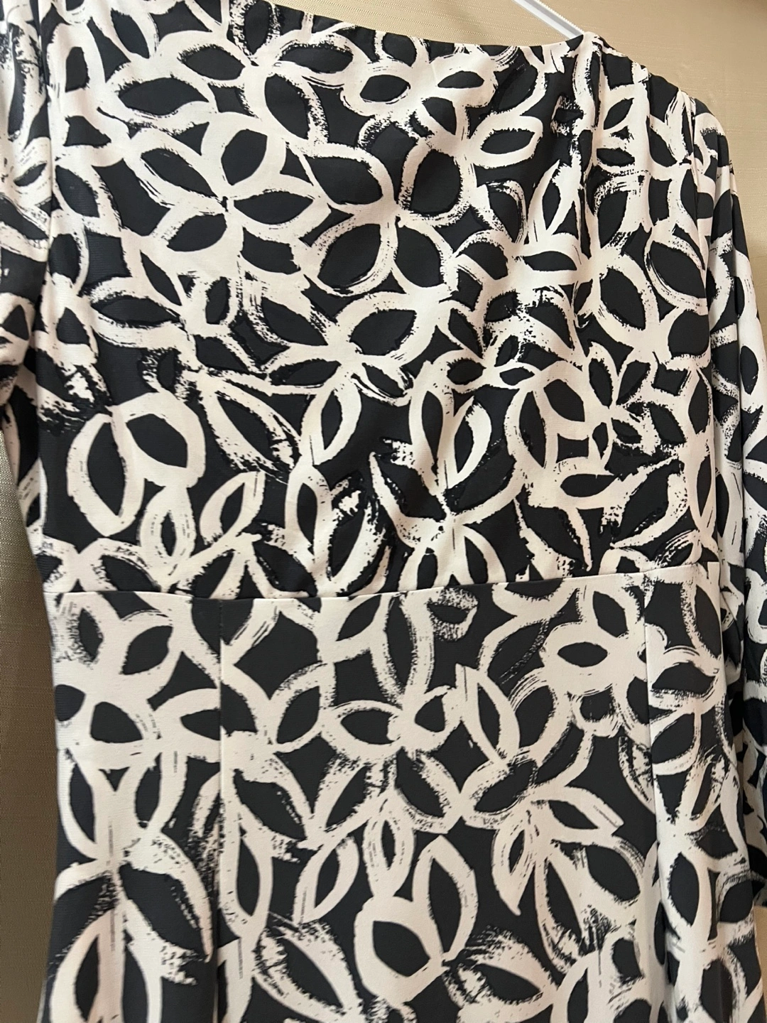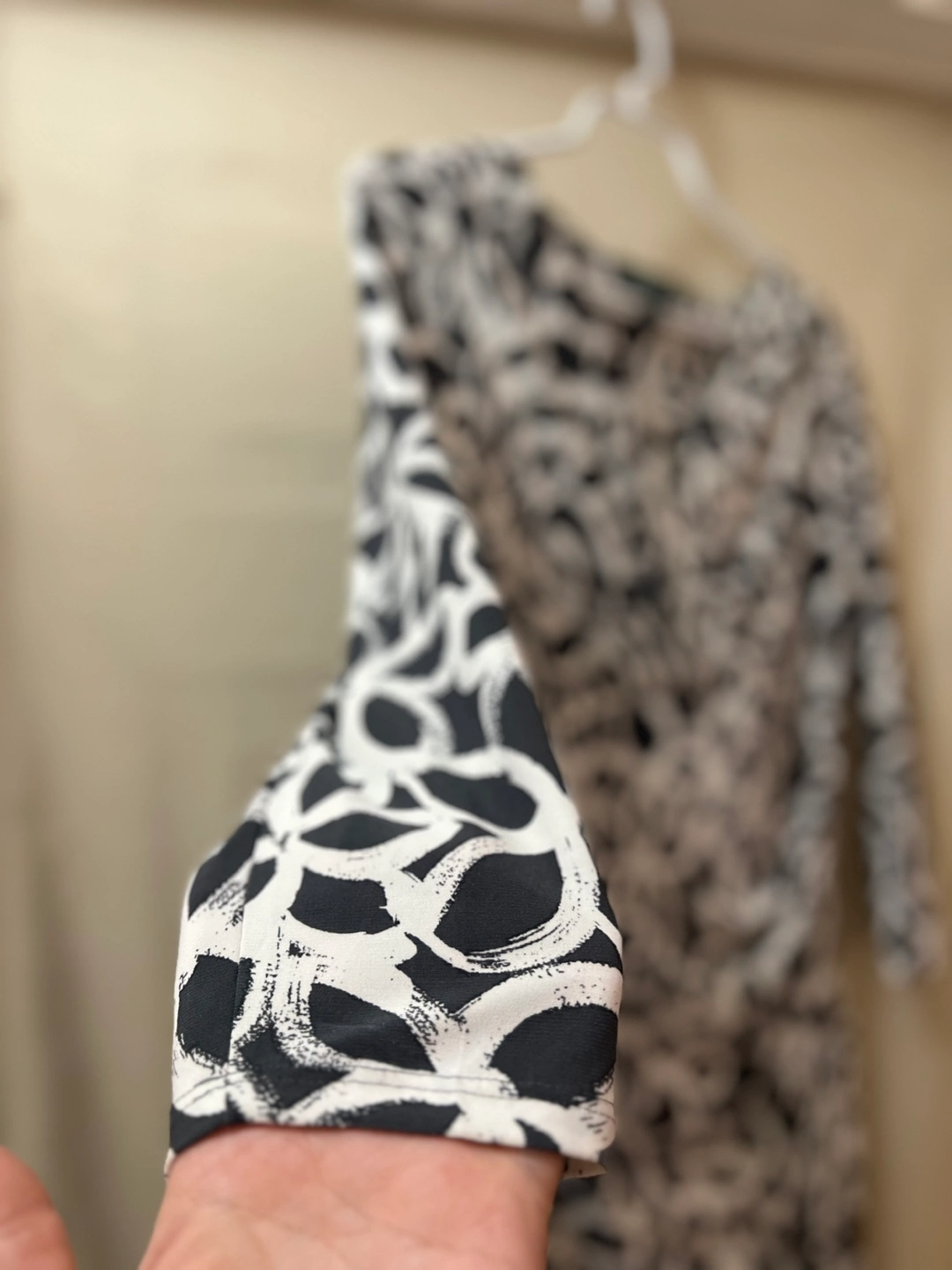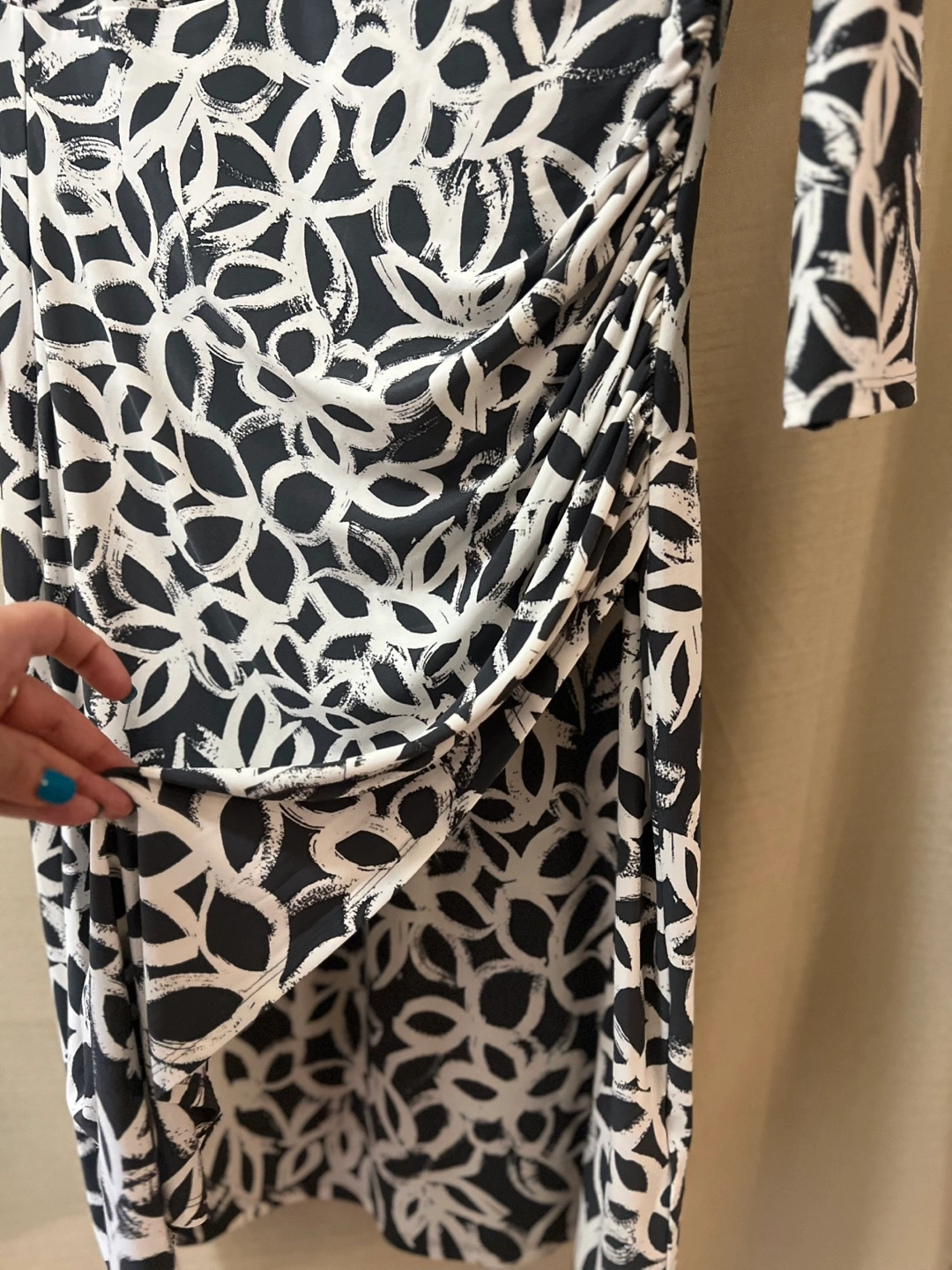 Beautiful grey and white abstract print dress. Three-quarter sleeves. V-neck. Ruched detail at the waist. Size 8. Ptp- 17.5 Length- 37 Arm- 18.5 Waist- 14.5