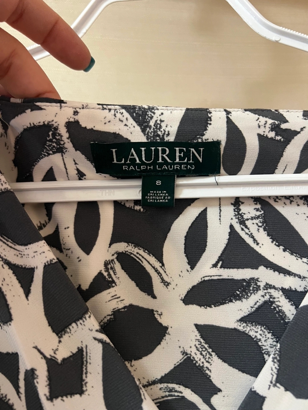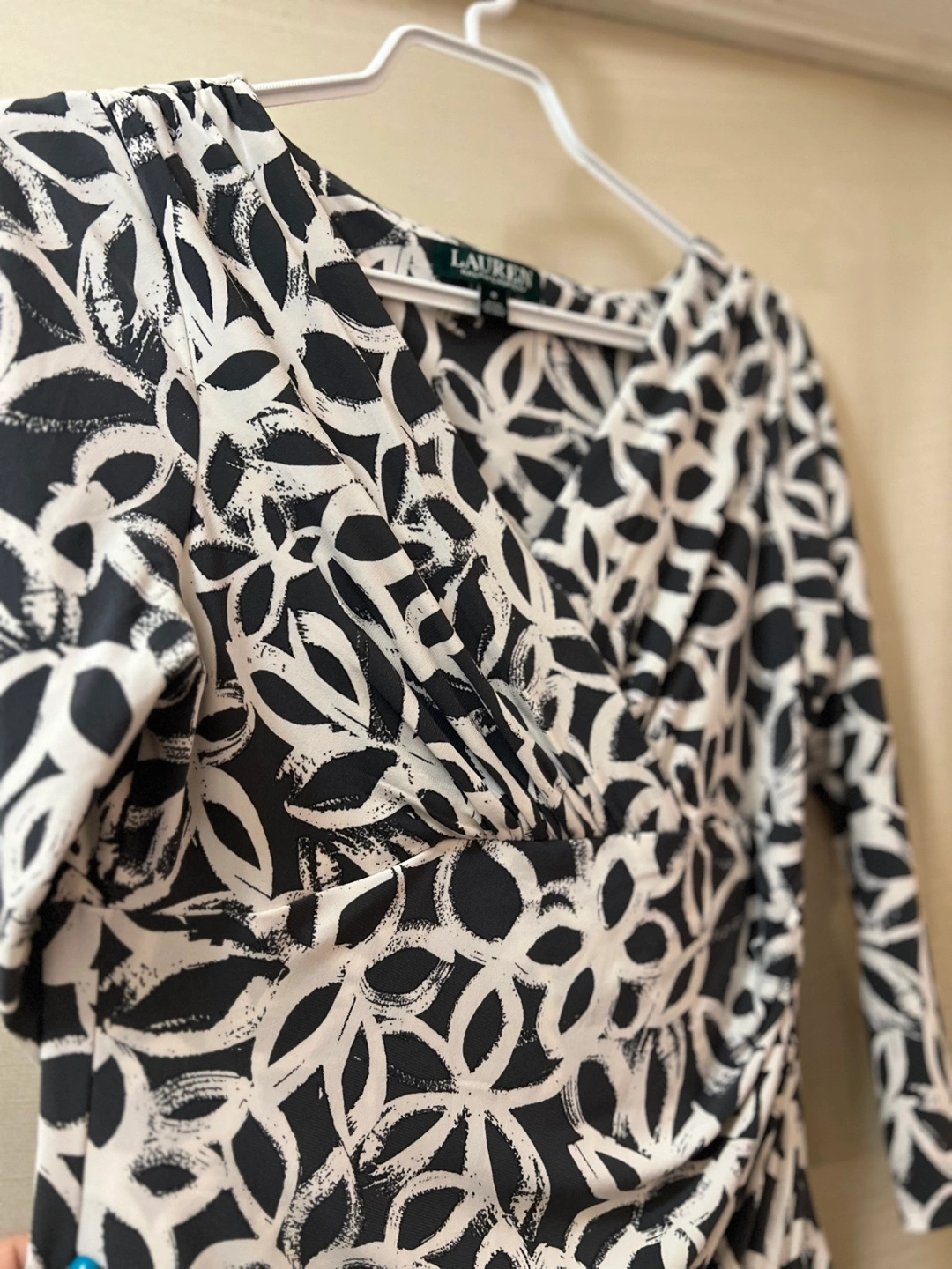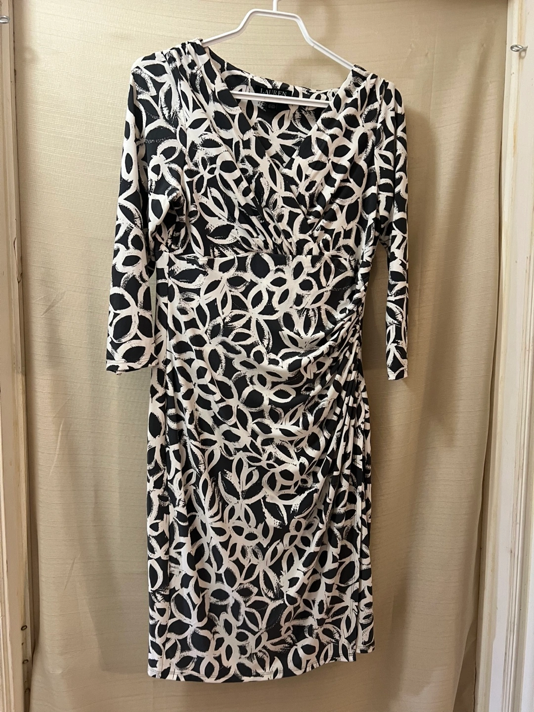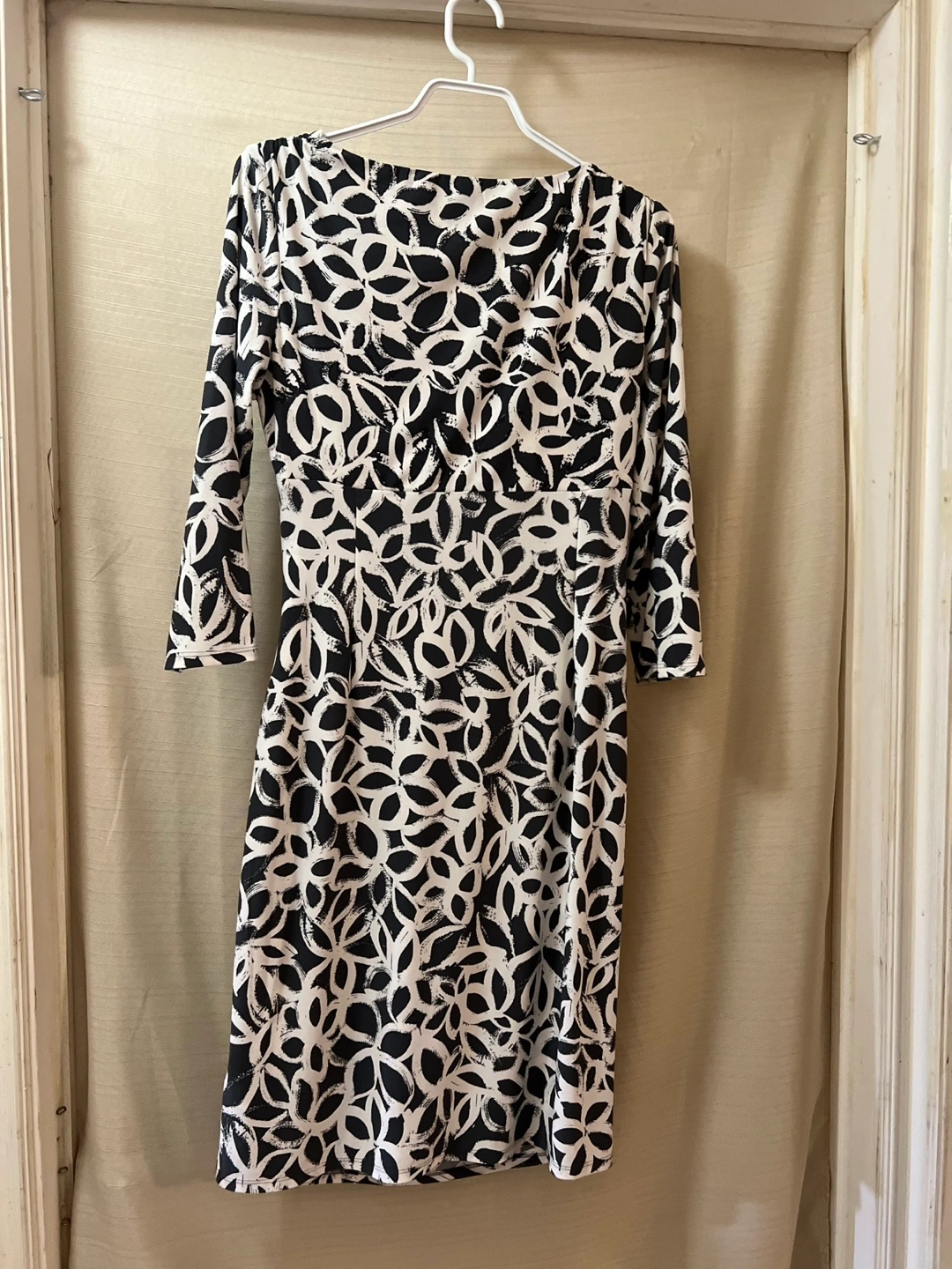 Beautiful grey and white abstract print dress. Three-quarter sleeves. V-neck. Ruched detail at the waist. Size 8. Ptp- 17.5 Length- 37 Arm- 18.5 Waist- 14.5