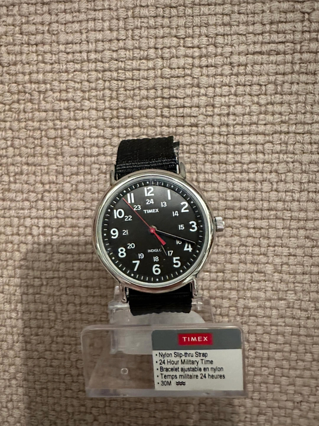 Timex wristwatch. Black nylon strap. 24-hour military time. $85 retail price Product: T2N647 Watch Movement: Quartz Analog Water Resistance: 30 meters Crystal / Lens: Mineral Glass Case Diameter: 38 mm Case Height: Case Material: BRASS and LLB Case Color: Silver-Tone Case Finish: Polished Dial Color: Black Dial Markings: Arabic (Full) Strap / Lug Width: 20 mm Strap Material: Fabric Strap Color: Black Strap Buckle: Buckle