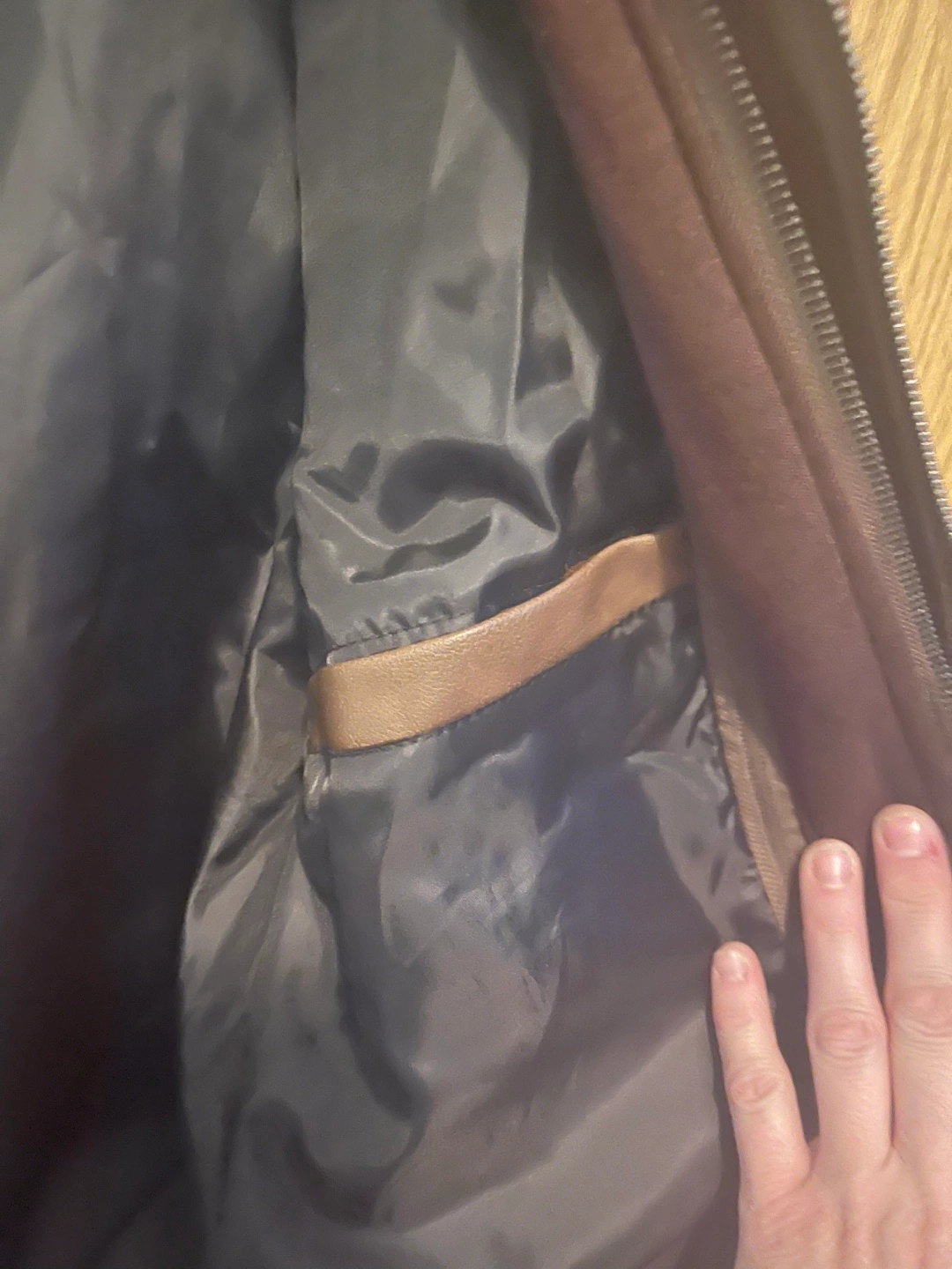 Brown faux leather jacket. Features a detachable hoodie, zipper closure, multiple pockets, and ribbed cuffs. Great for fall and winter. Brand New Never worn.. my dad bought and ended up getting 2 of them and wasn't worth sending back Have 2 of them Pet Friendly/Ns