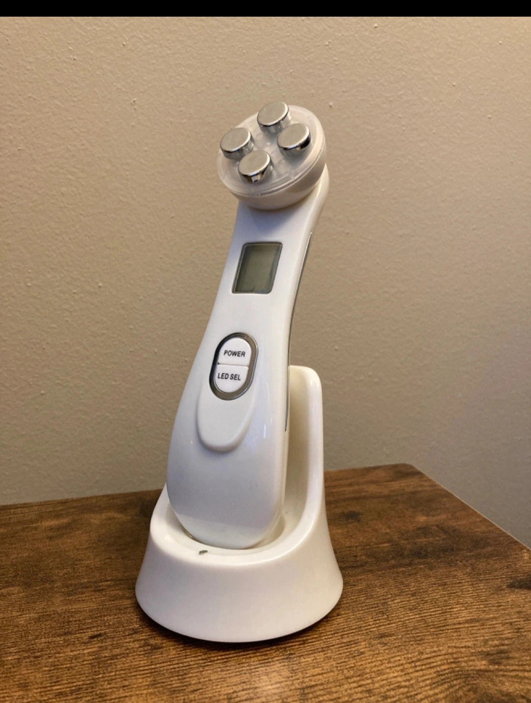 White handheld device. Features four LED lights and digital display. Includes charging stand. Great for at-home skincare.
