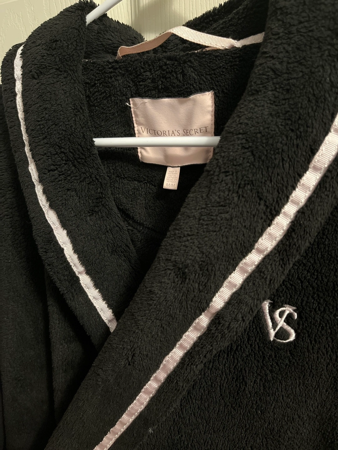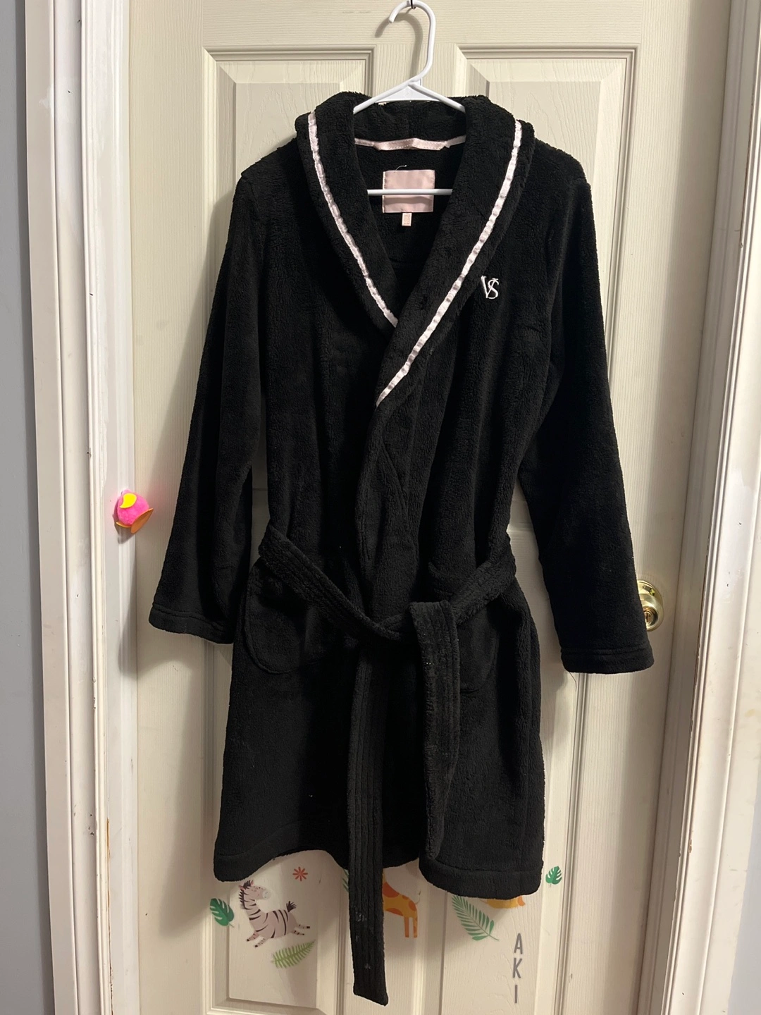 Women's black plush robe. Features a hood, belt, and satin trim. Size Medium. Soft and cozy.