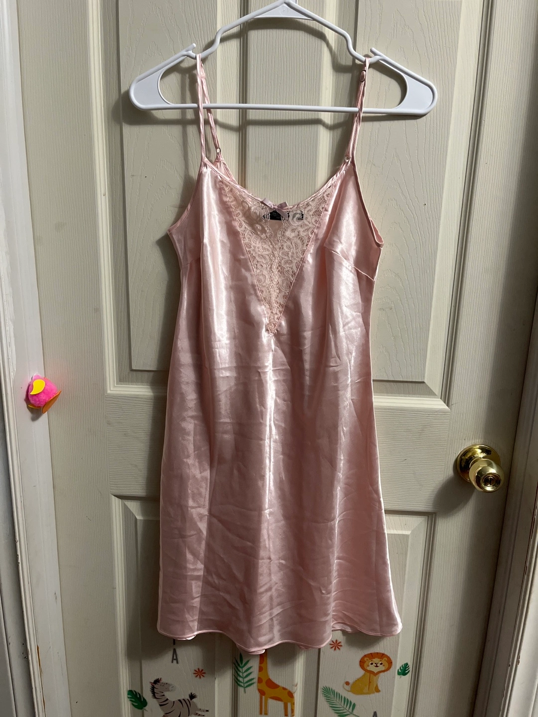 Beautiful pink satin slip dress. Features delicate lace detailing at the neckline. Adjustable spaghetti straps. Lightweight and comfortable. Perfect for lounging or sleeping.