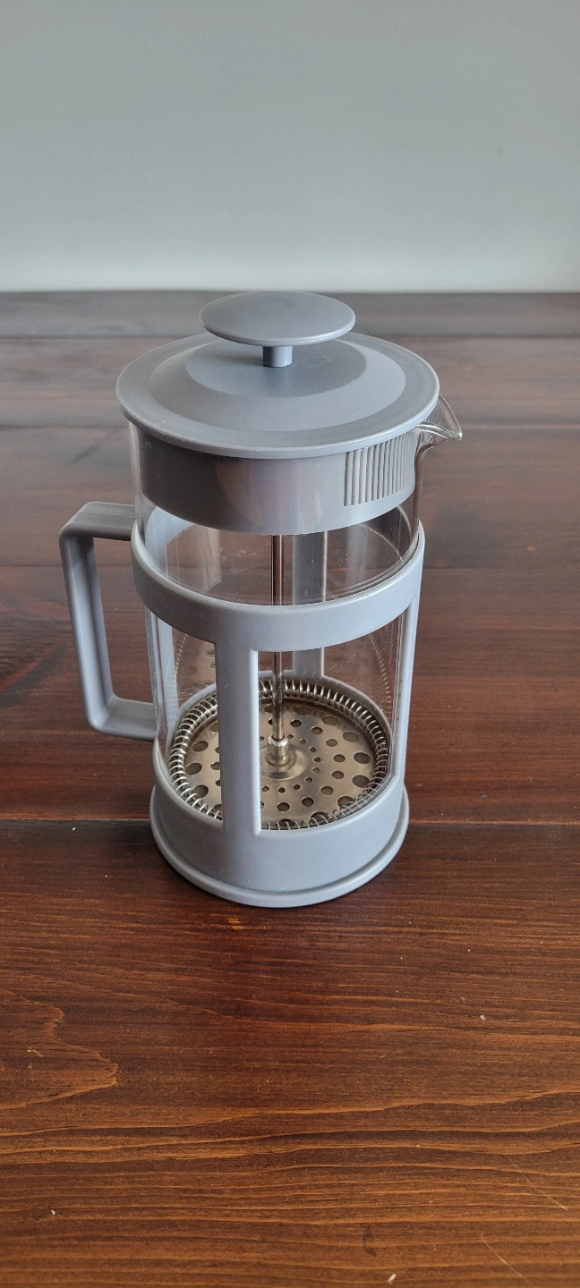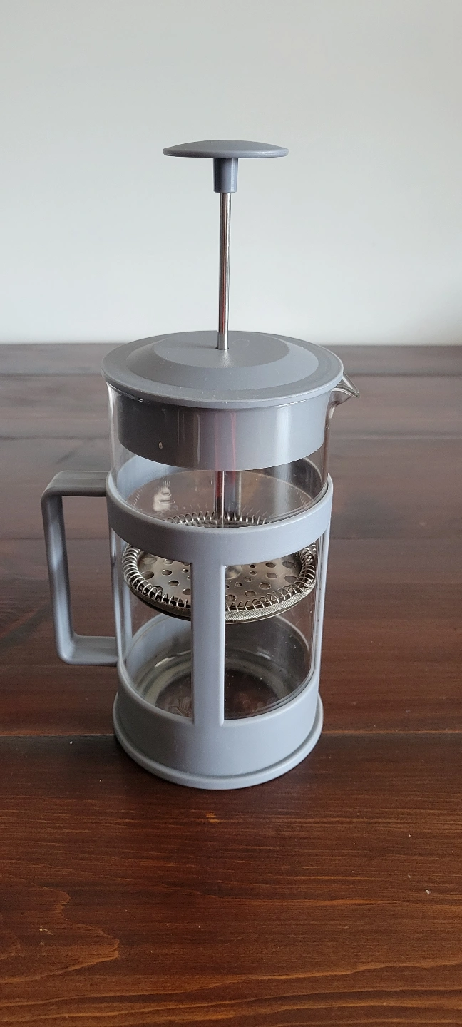 Durable glass construction. Grey silicone sleeve. Easy to use. Makes delicious coffee.
