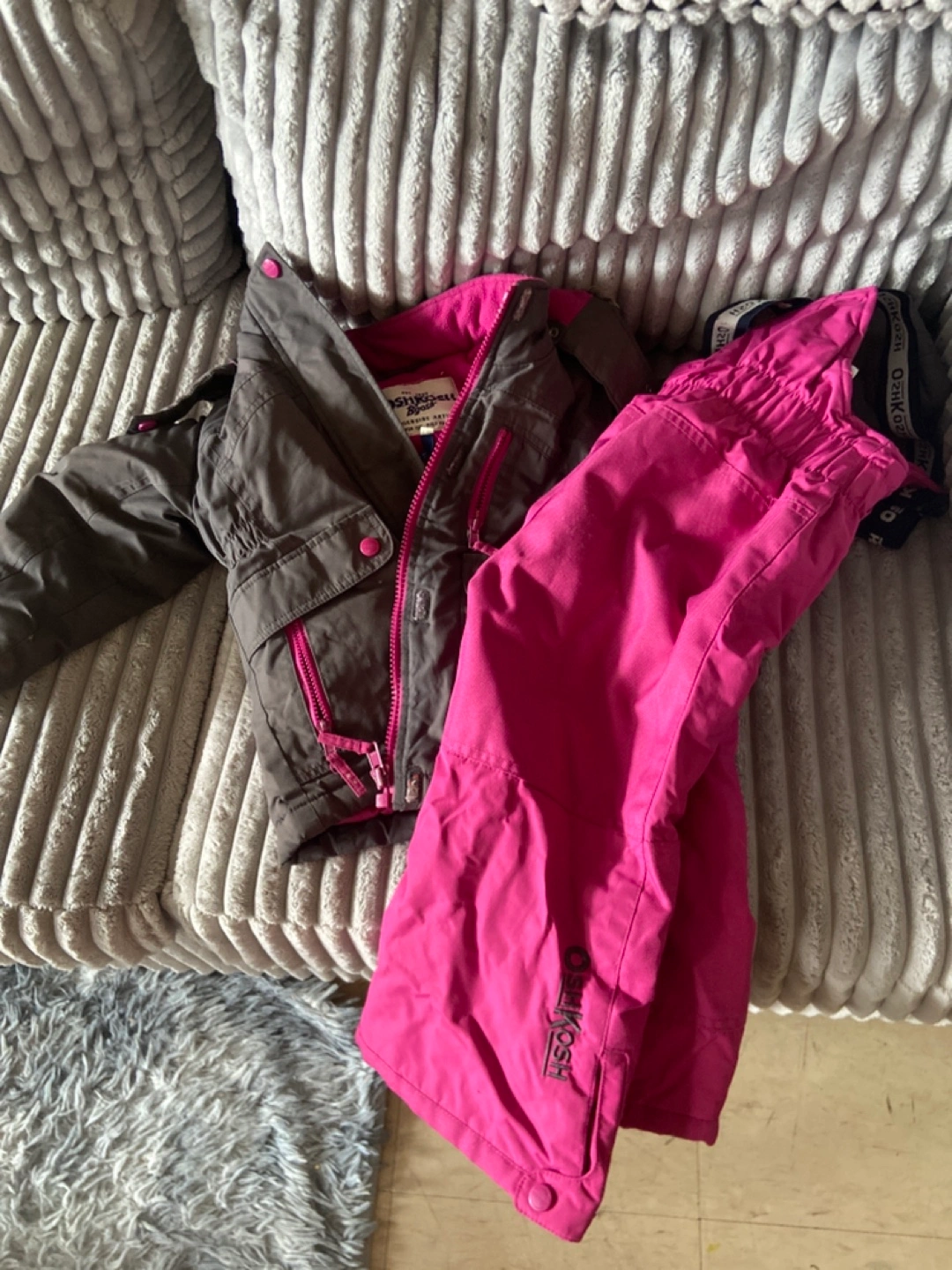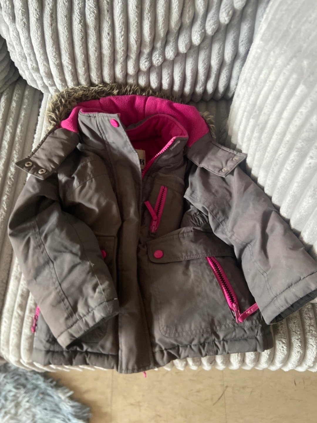 Grey winter jacket with pink accents. Faux fur trim hood. Zipper and snap closure. Two zippered pockets. Great for colder weather. Plus snow pants full suit $15 together
