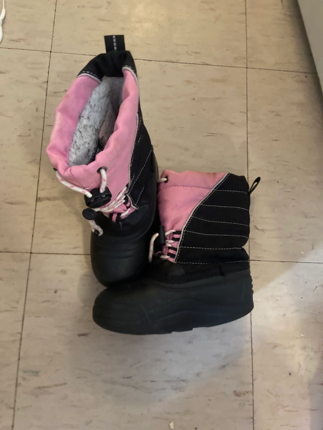 Pair of kids' snow boots. Pink and black colour scheme. Waterproof rubber soles. Good for winter weather. Size 11 kids