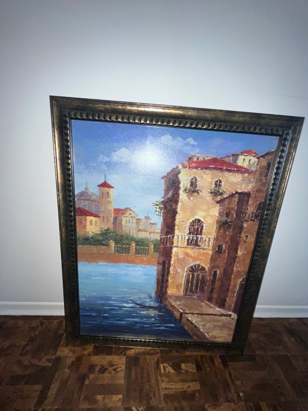 Beautiful framed canvas painting. Depicts an Italian cityscape with buildings and water. Ornate bronze-coloured frame. Ready to hang.