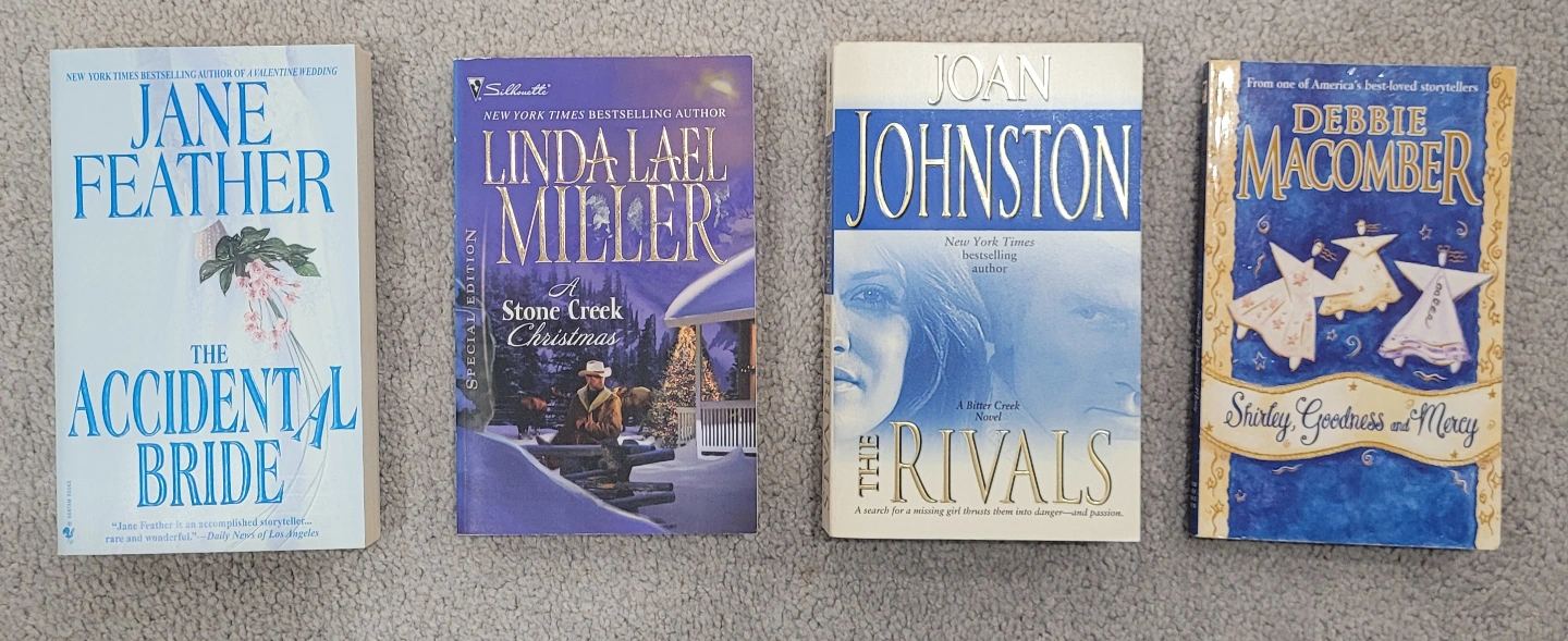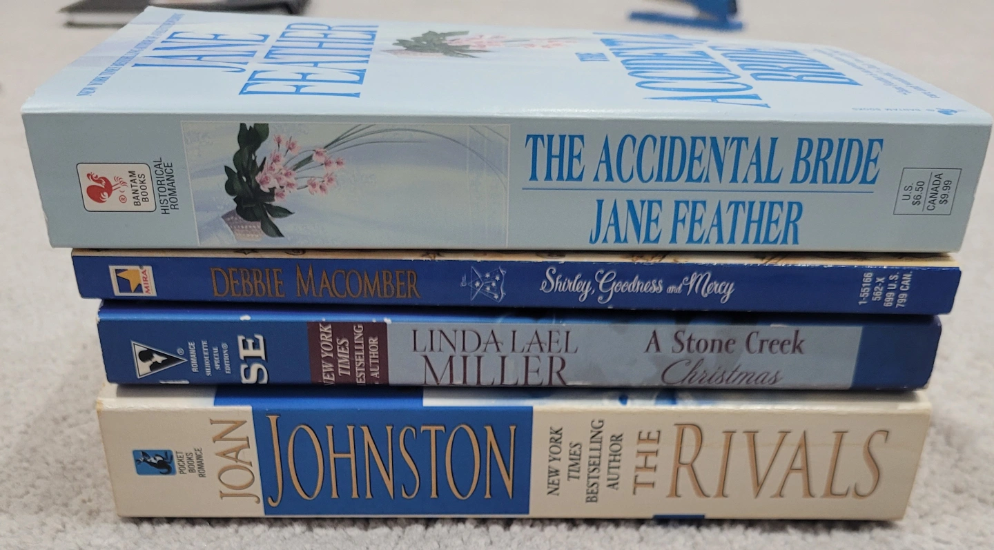 Paperback novels. Authors include Jane Feather, Debbie Macomber, Linda Lael Miller, and Joan Johnston. Various titles.