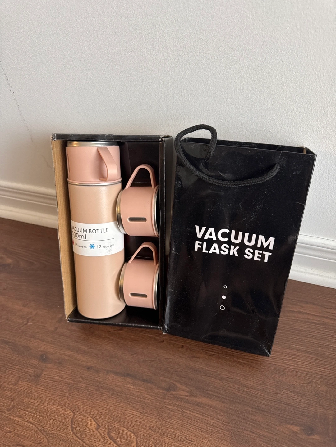 New vacuum flask set. Includes one 500ml vacuum flask and two matching cups. Keeps drinks hot or cold for hours. Pink colour.