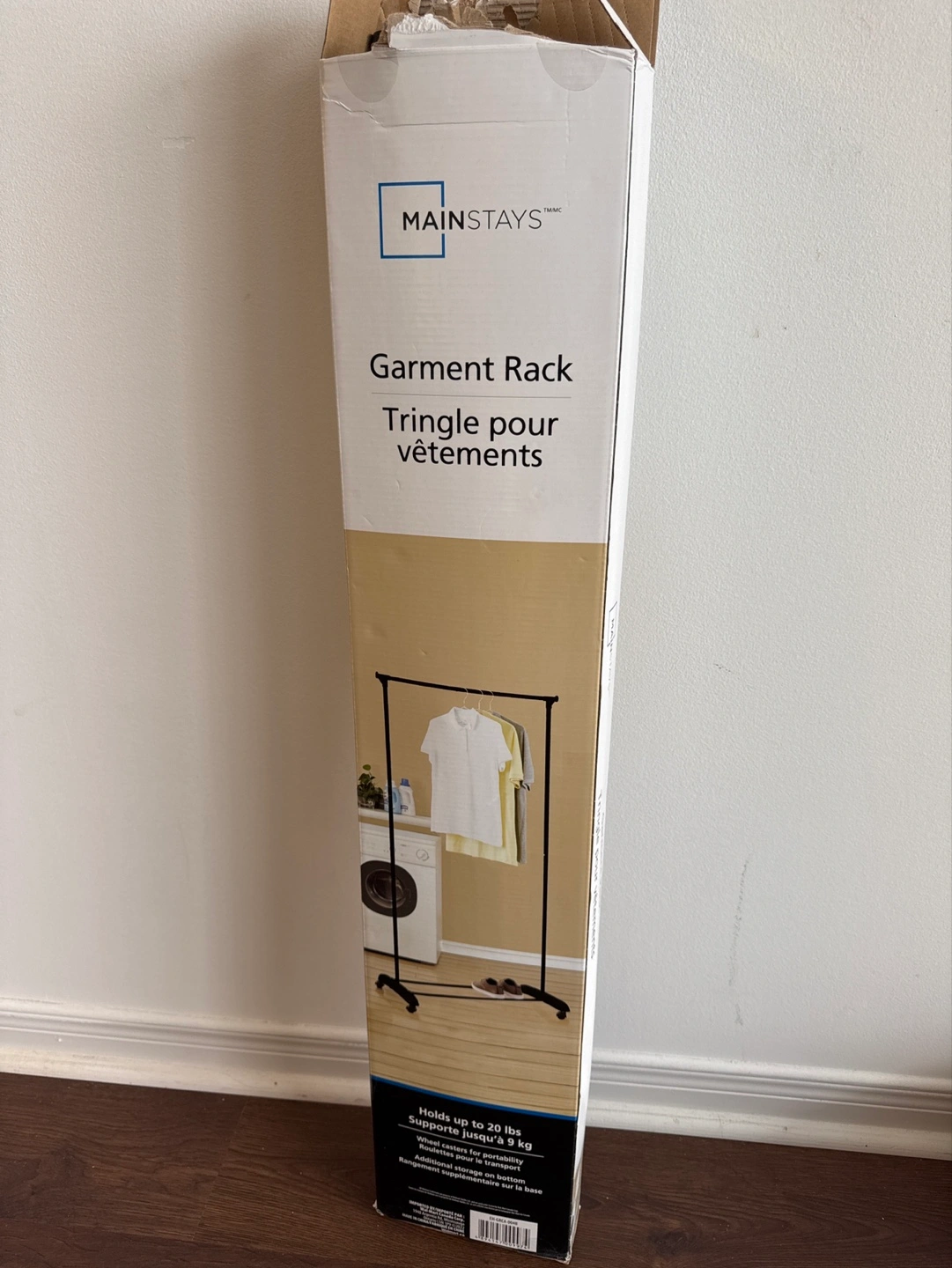 Portable garment rack. Holds up to 20 lbs. Features wheel casters for easy movement. Additional storage underneath. 99% new