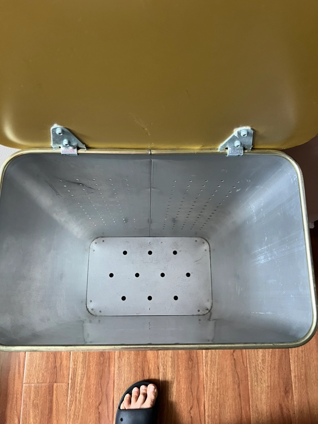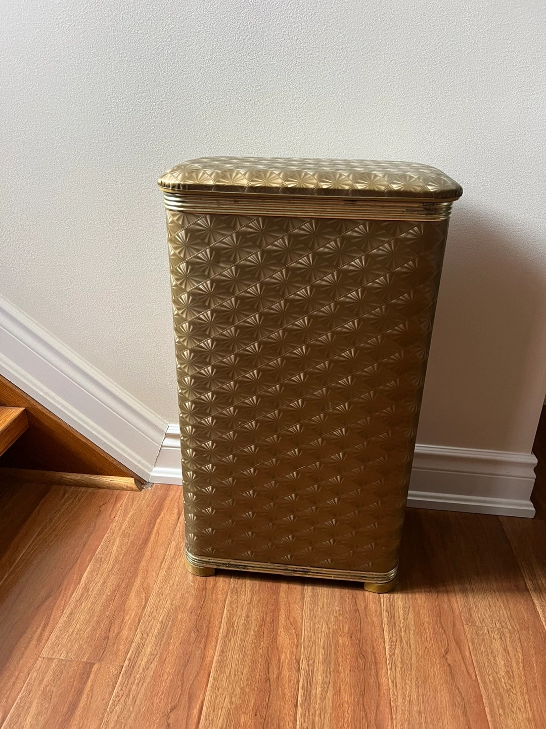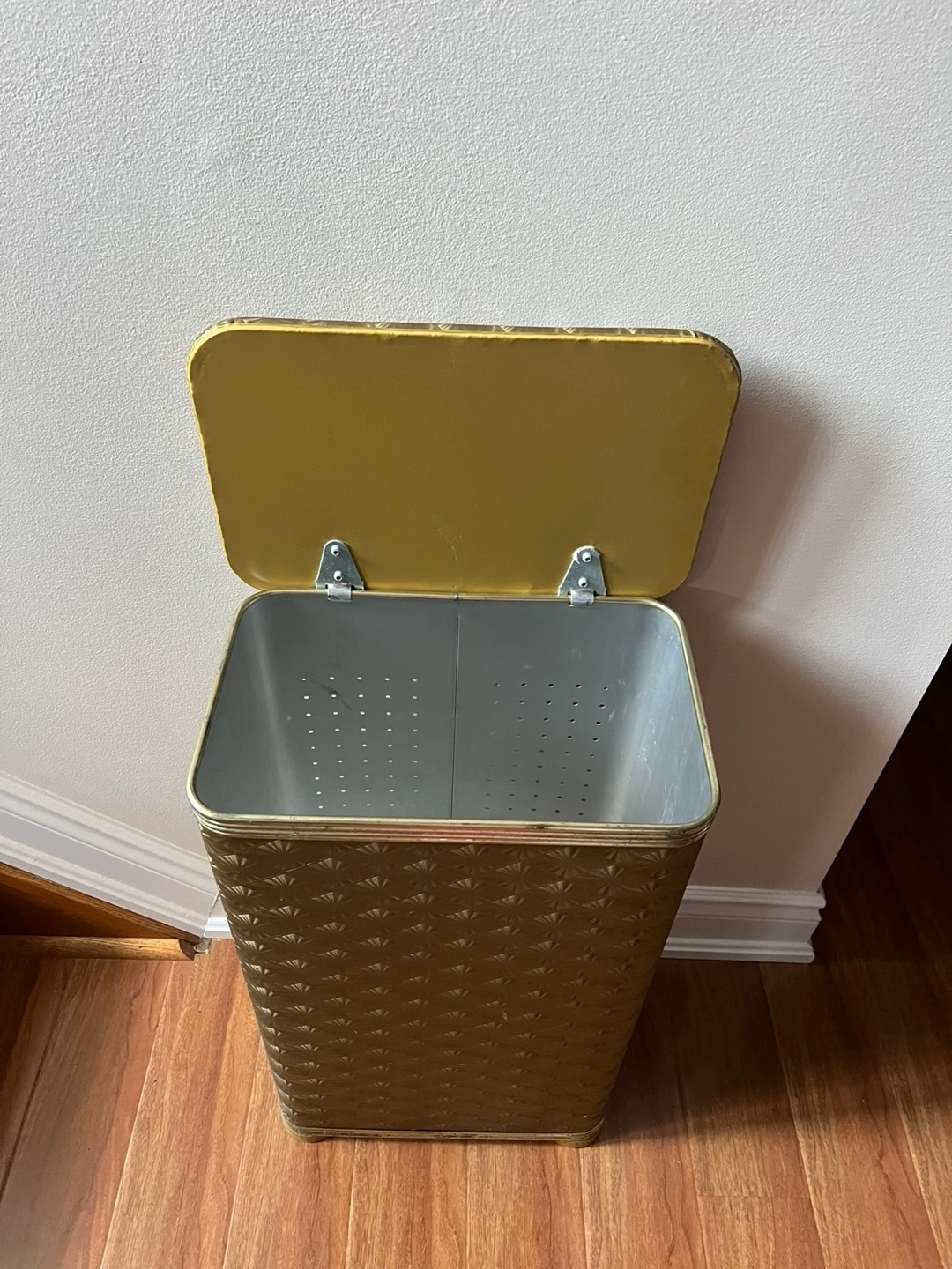 Large gold metal laundry hamper. Features a patterned exterior and hinged lid. Interior is perforated metal.