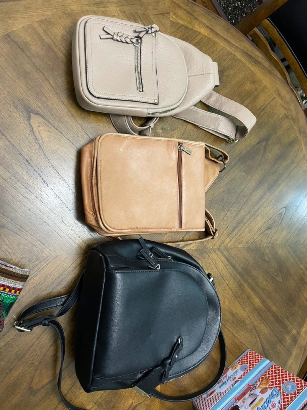 Three gently used bags. One beige crossbody bag with a braided accent. One tan leather-like sling bag. One black backpack with drawstring accents. All show minor wear.