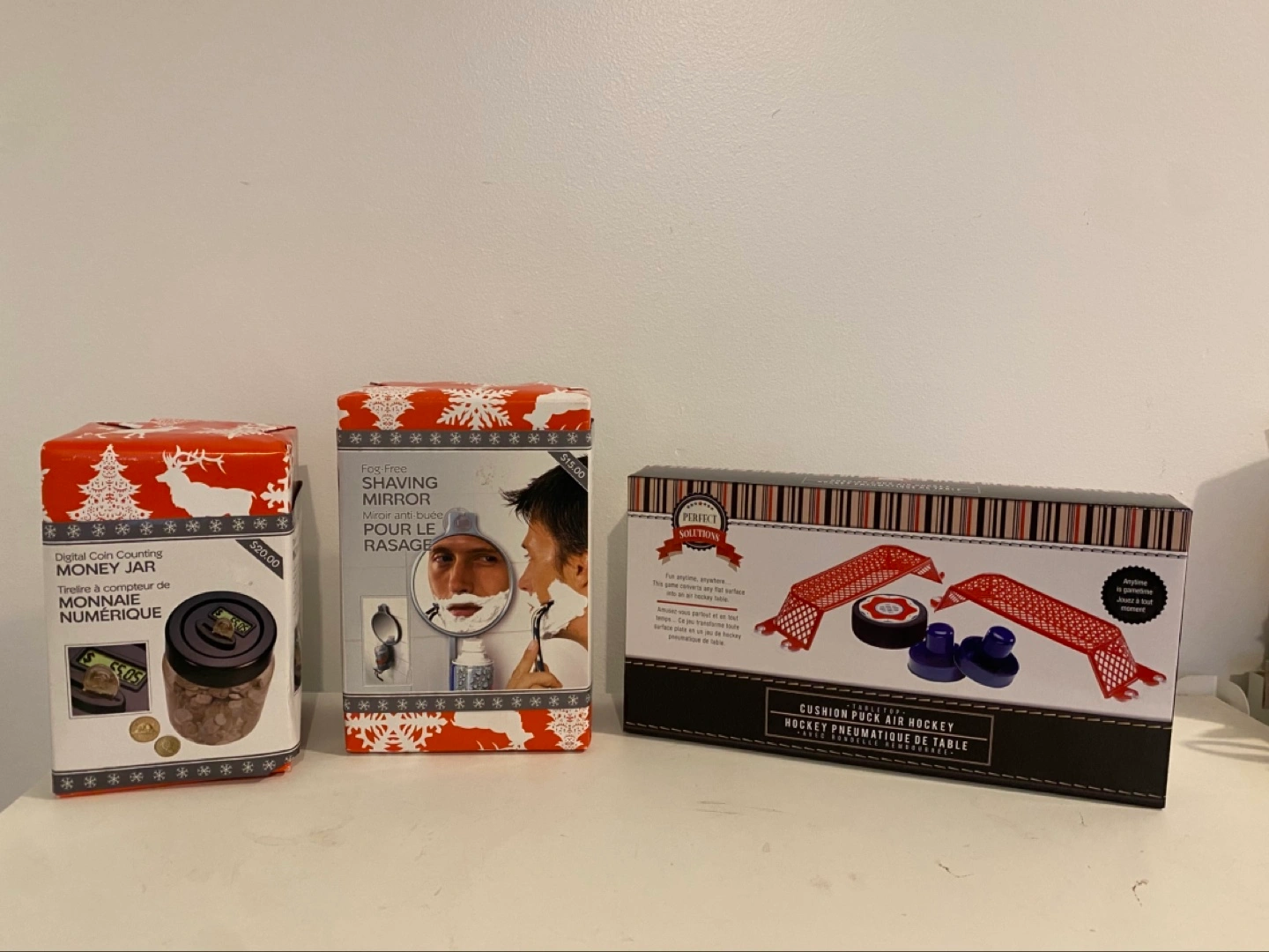 All brand new. Not selling individually. All 3 for $10. Great stocking stuffers. Original prices: money jar $20 tabletop air hockey $20 fog free shaving mirror $15 Pick up ONLY in East End Toronto (Gerrard St East and Carlaw Ave area)