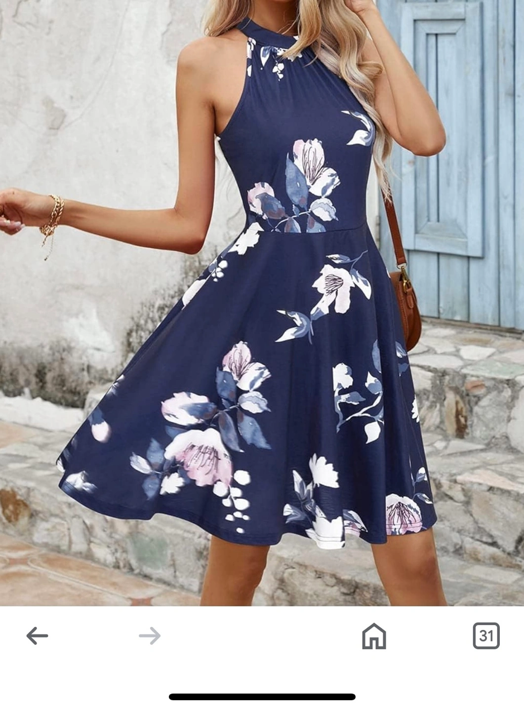 Adorable navy blue mini dress. Features a halter neck and a flattering fit and flare silhouette. Pretty floral print. Perfect for summer.