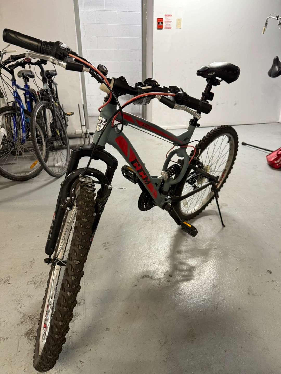 As it is. Grey and red mountain bike. Front suspension forks. 26 inch wheels. Good condition. Pick up only. Back wheel has to be balanced but not big issue.