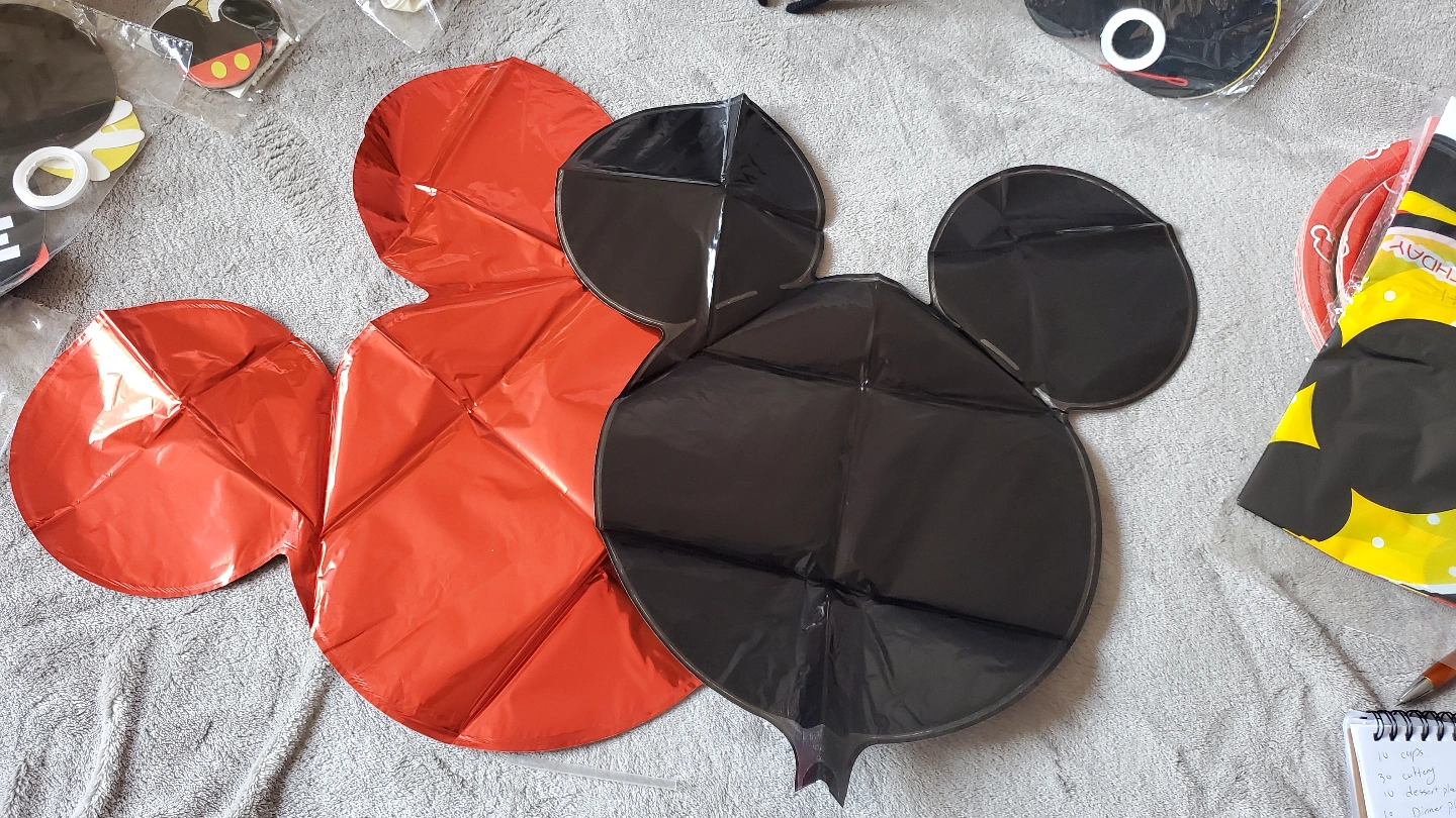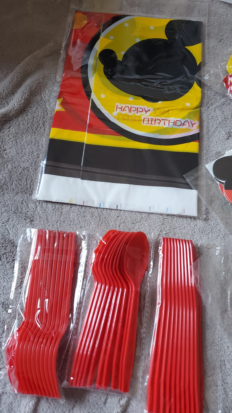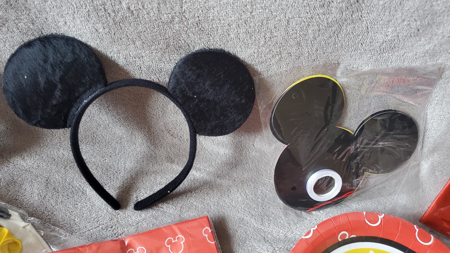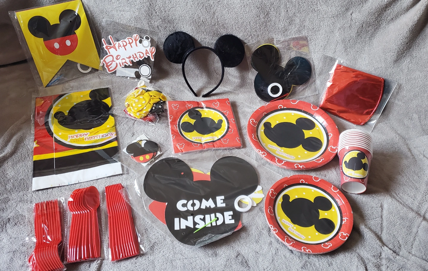 Mickey Mouse themed party supplies. Includes 1 Mickey headband, 1 welcome door hanger, 10 dinner plates, 10 dessert plates, 10 cups, 30 cutlery, napkins, 2 banners, 16 balloons, 2 foil balloons, 12 cupcakes topper, 1 cake topper and 1 table cover. Perfect for a birthday celebration. Unused. Pick up Hespeler Cambridge