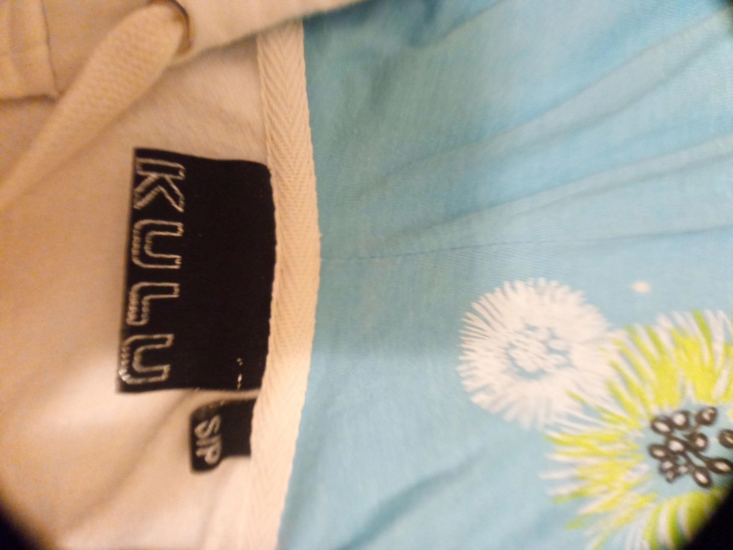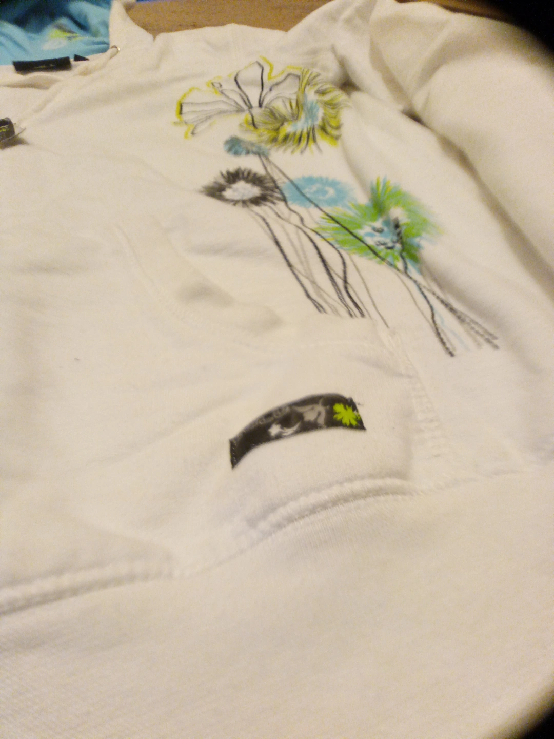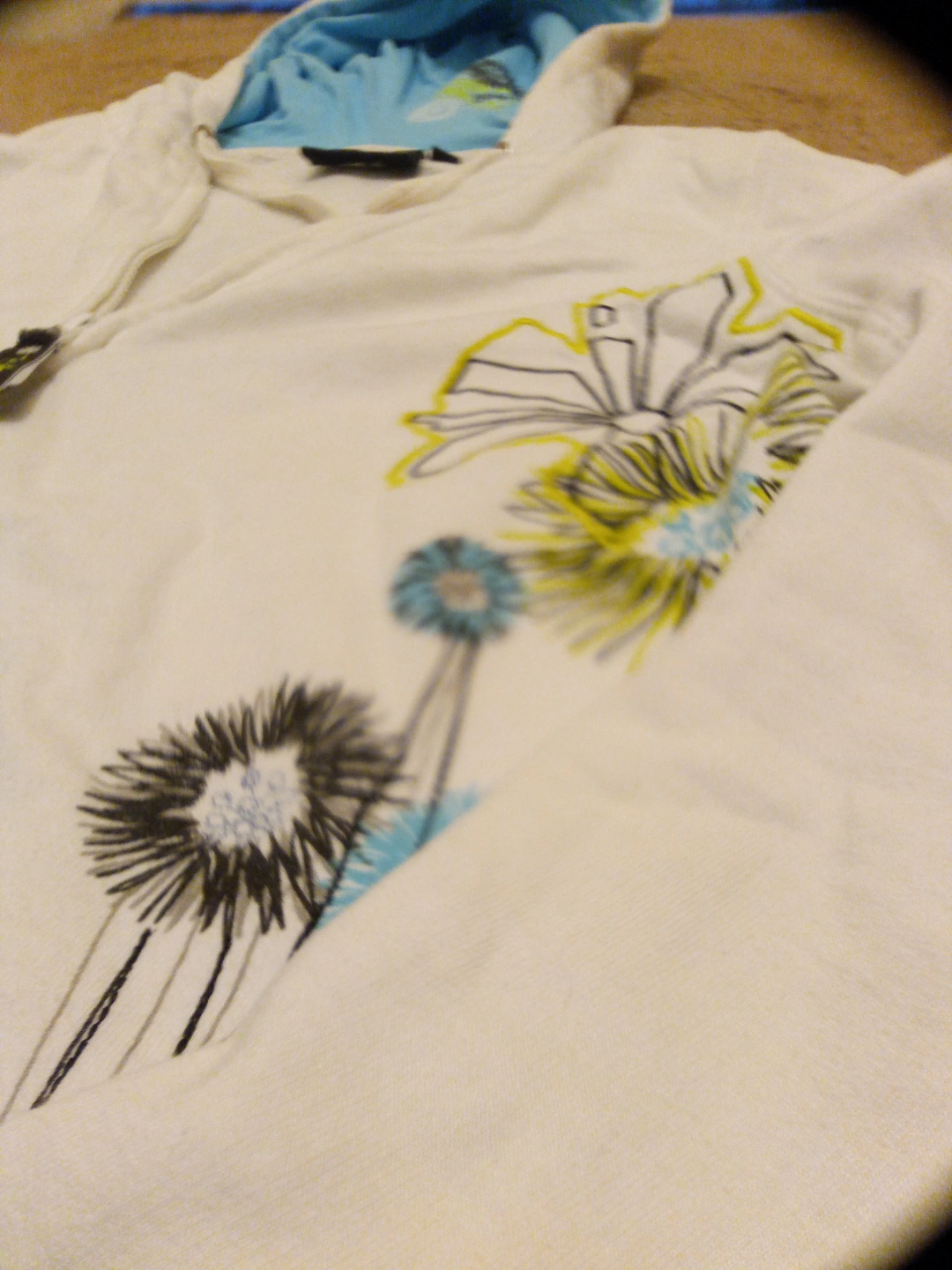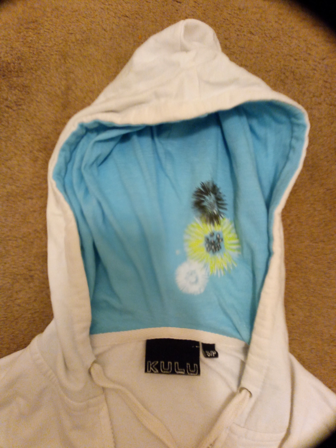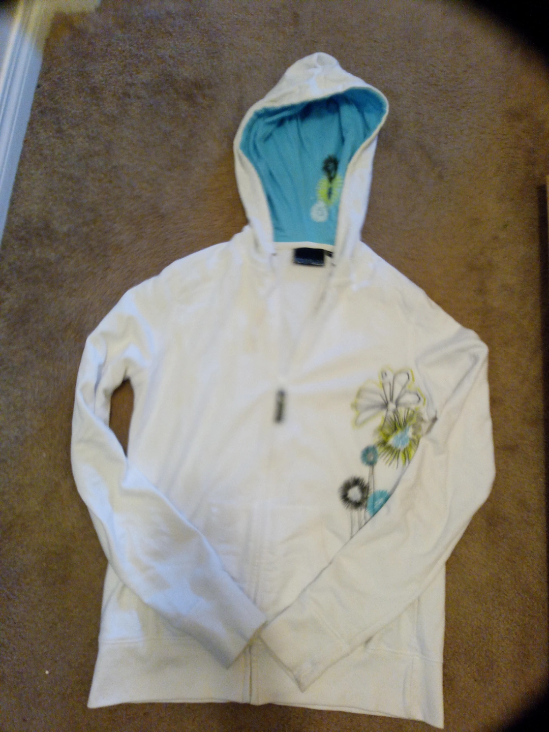 White zip-up hoodie. Features a light blue interior hood lining and floral design. Size small.