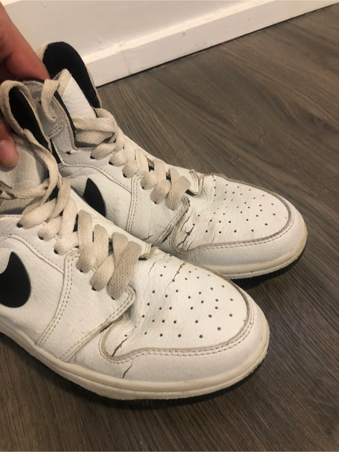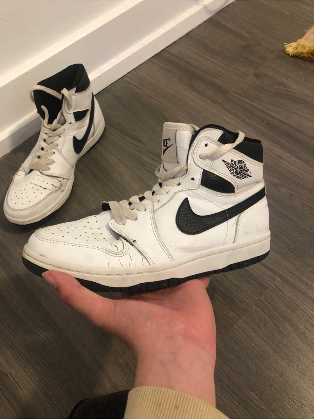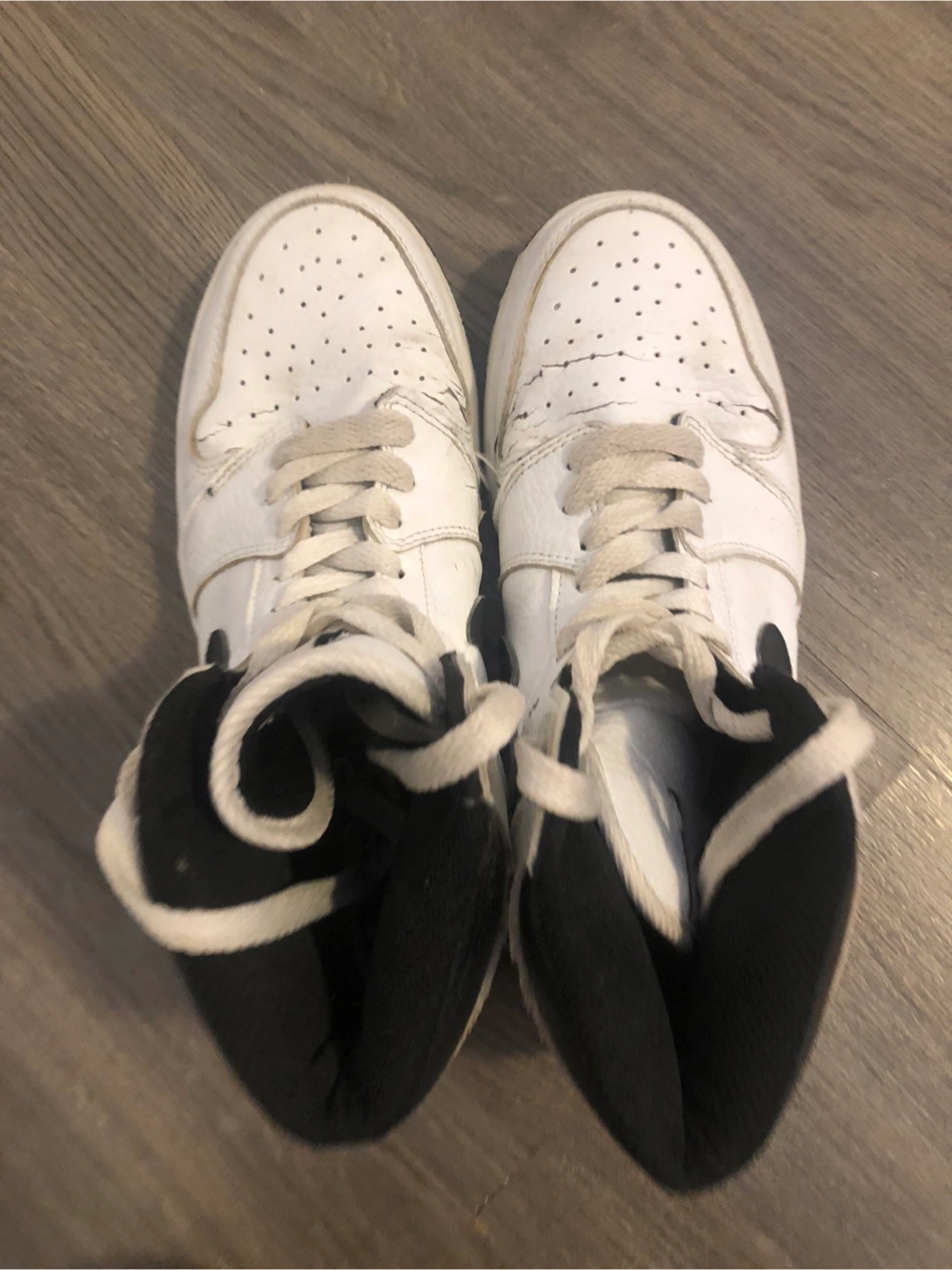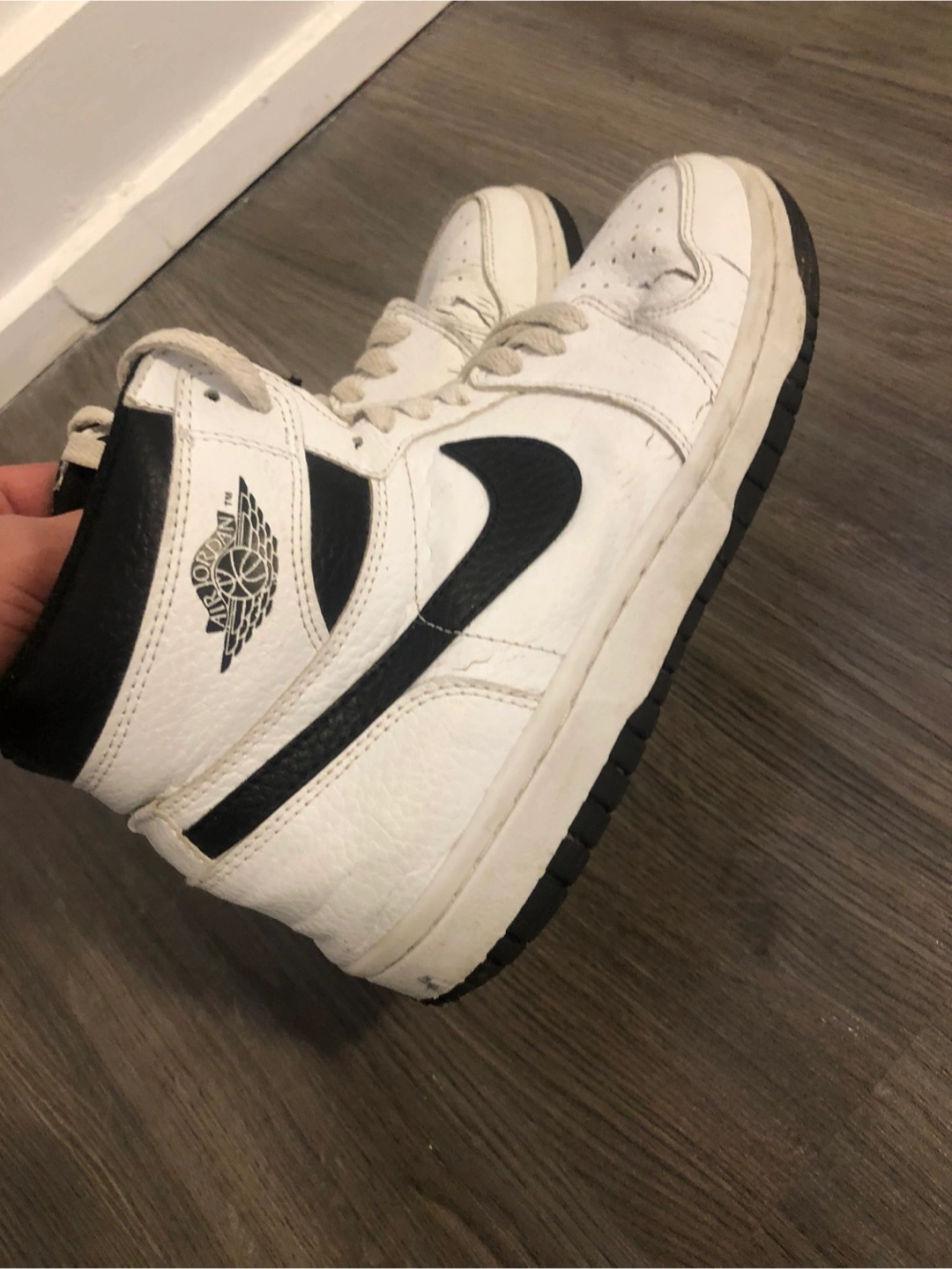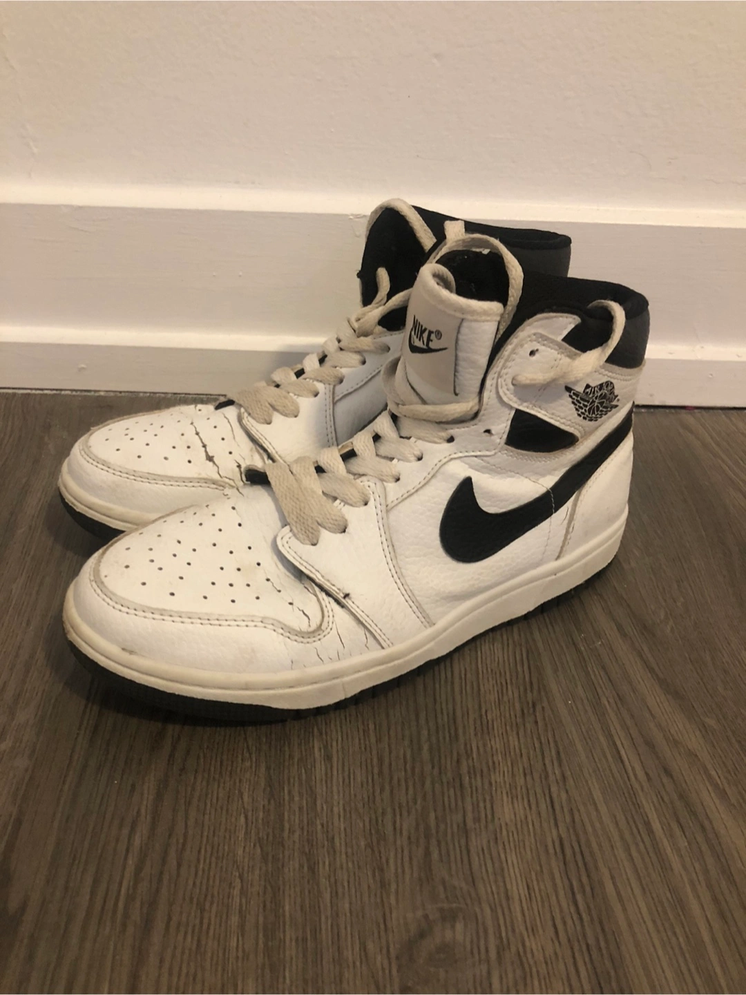 Pre-owned Air Jordan 1 High. White leather upper, black accents. Some wear and tear visible. Classic sneaker style.