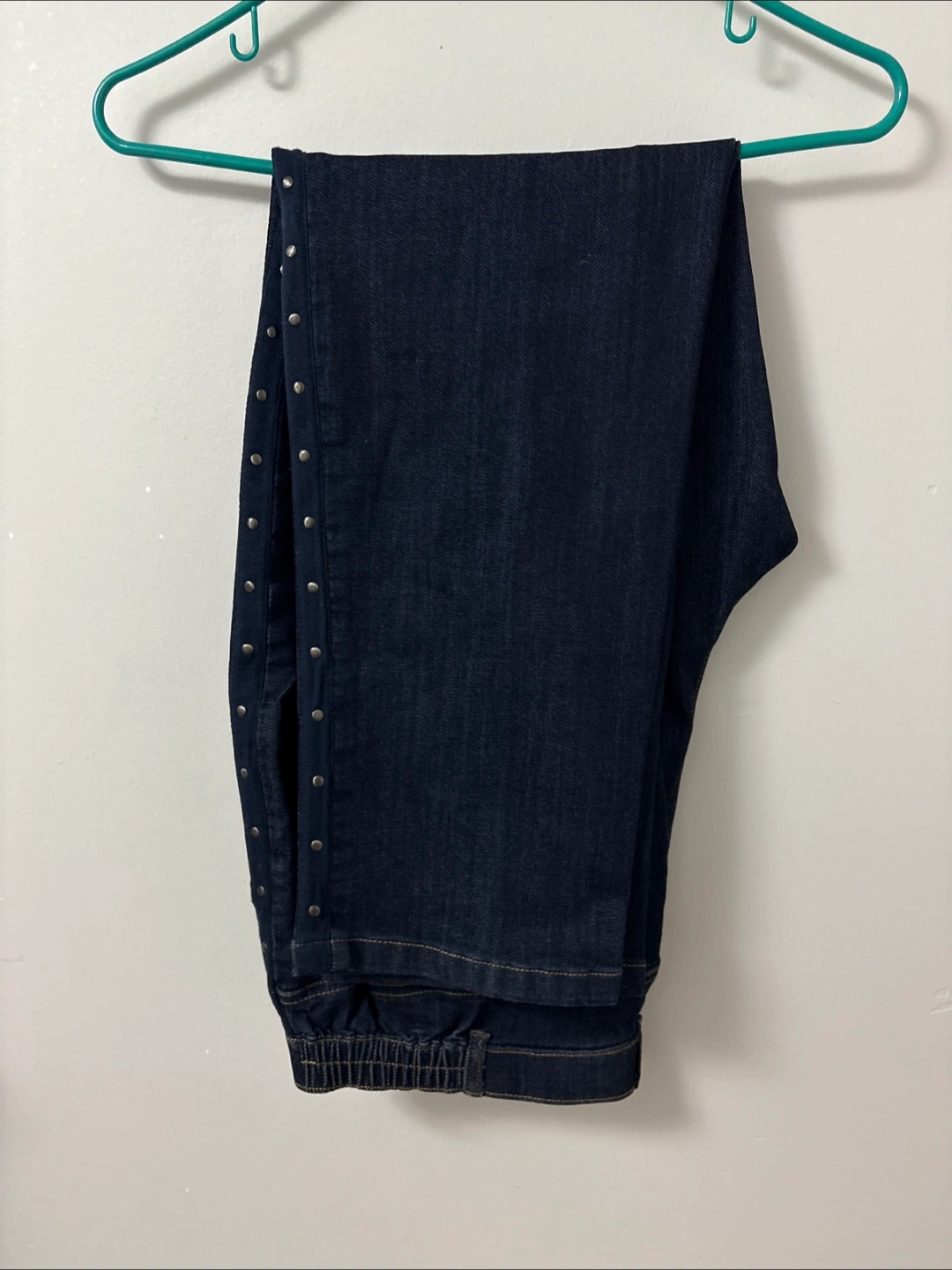 Women's dark wash denim jeans. Features a comfortable elastic waistband and decorative metal studs along the side seams. Straight leg style. Sorry, won’t respond to “Is this available” If the ad is up, it is available.