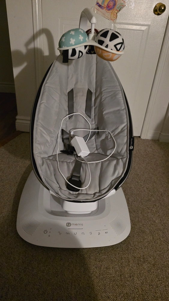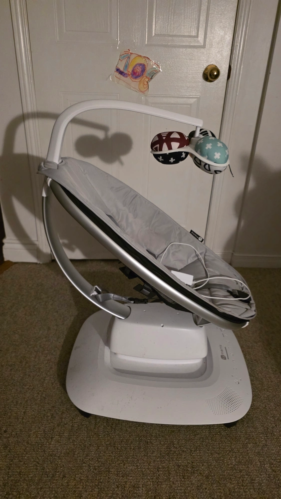 Selling a gently used 4moms MamaRoo baby swing! It's in great condition and comes with the original charger. This swing is perfect for soothing your little one with its different motions and speeds. It also includes the mobile with the soft, plush balls to keep baby entertained. A great item to help keep your baby happy!