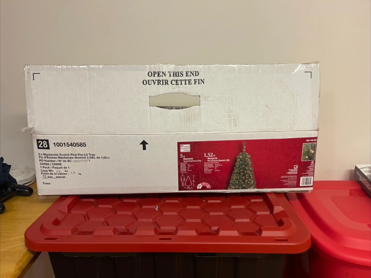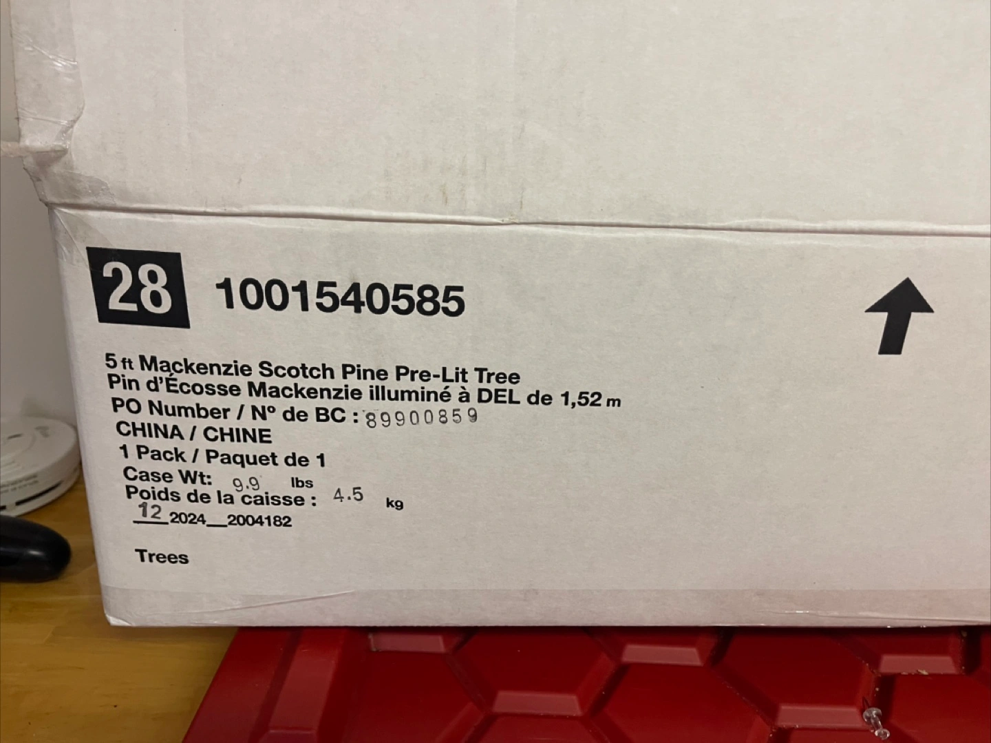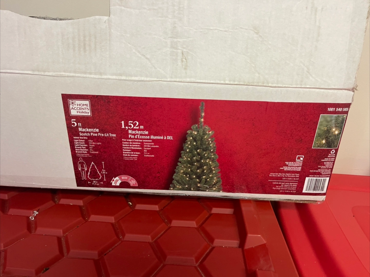 Selling a 5 ft Mackenzie Scotch Pine Pre-Lit Tree! It's an artificial tree that comes in its original box. The box indicates a case weight of 9.9 lbs or 4.5 kg.