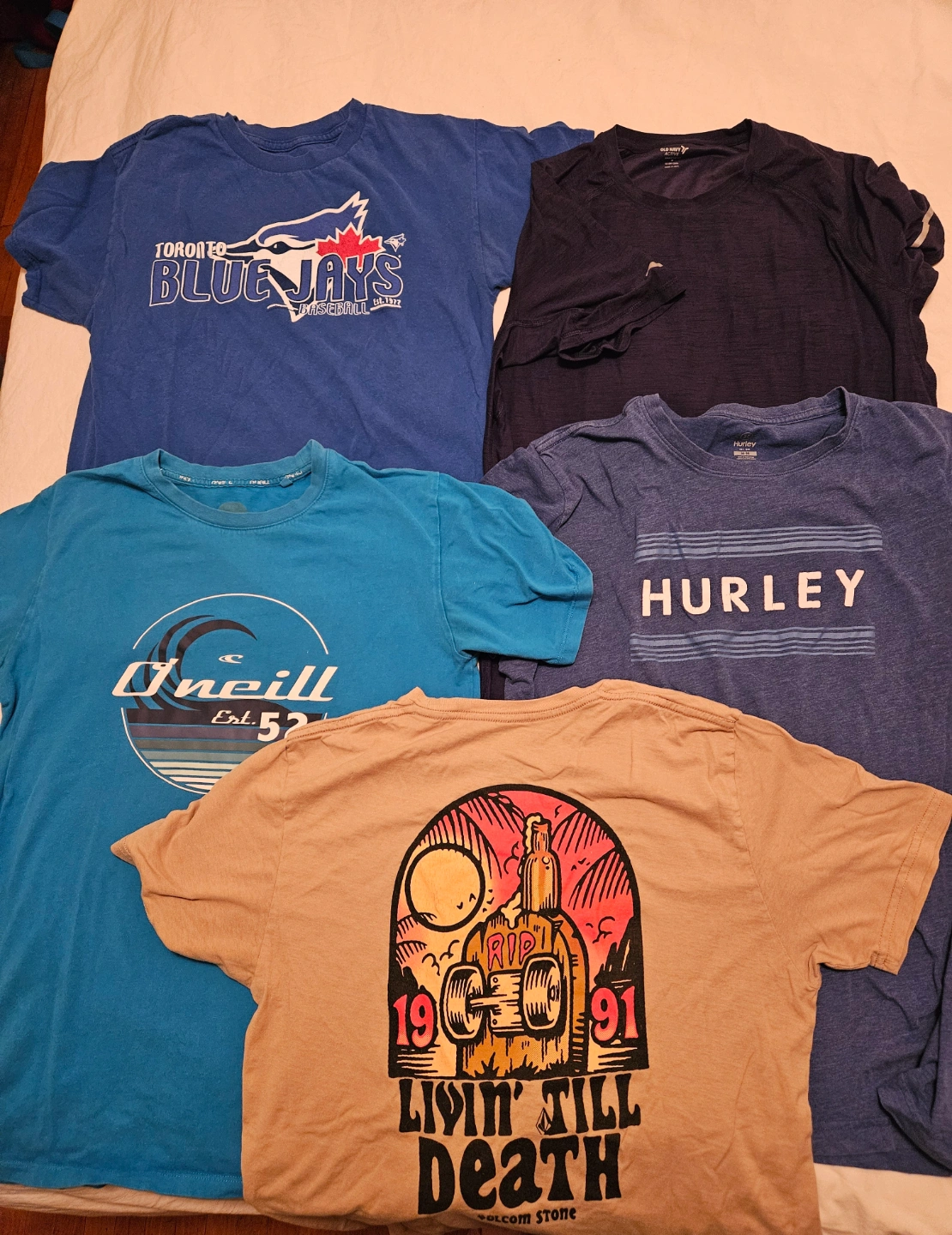 Men's t-shirts very good conditon size M. Pick up Vic Park & St.Clair. Blue Jays, O'Neill, Hurley, Old Navy (active moisture wicking navy colour) and Winners brands. Can separate if interested. No holds, fastest pick up. Price is for all 5. Cross-posted.