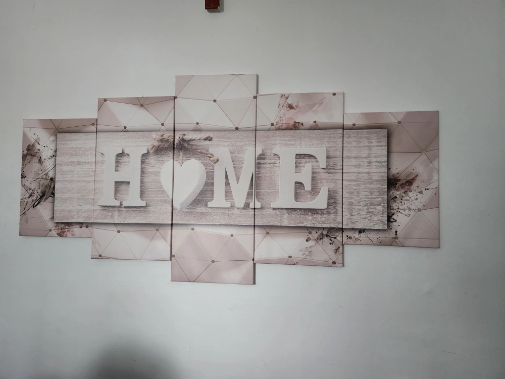 Beautiful 5-piece canvas wall art. Features the word HOME with a heart. Neutral colours. Perfect for living room or bedroom. asking 60 obo pick up in Niagara falls juice box to show how big it is ot takes up the whole wall. . from Amazon was over $100