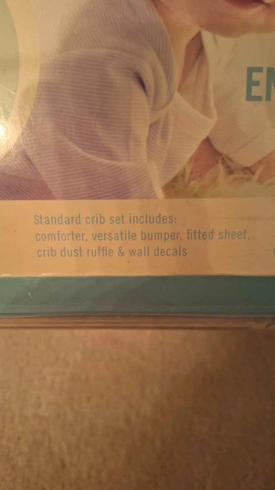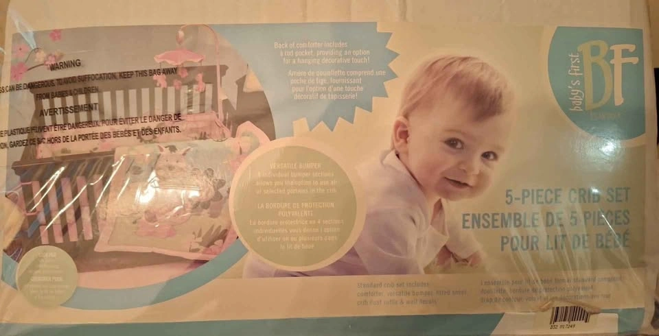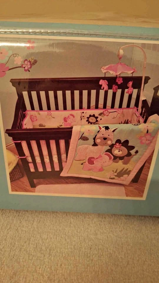 Baby crib set. Includes: comforter, bumper, fitted sheet, dust ruffle, wall decals. Clean and like new. Pickup in Port Moody, evenings and weekends only.
