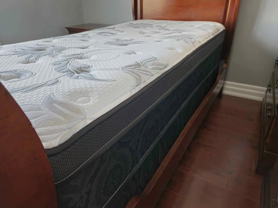 5-piece twin bedroom set for sale. In fantastic condition as you can see from the pictures. This set includes: 1) Twin Size Bed Frame - $200 2) Nightstand - $100 3) Tall Dresser - $200 4) Dresser and Mirror - $200 5) Mattress and Mattress Box - $200 Bundle Deal: Get the whole set for $800! Colour: Red-Brown Mahogany Material: Solid Wood Dimensions: Bed Frame H (headboard) = 47 1/4" H (footboard) = 38 1/2" W = 42" L = 86" Nightstand H = 26 1/2" x W = 26" x D = 16" Tall Dresser H = 54 3/4" x D = 20 1/4" x W = 40 1/4" Dresser with Mirror Mirror: H = 34" x W = 32" x D = 2" Dresser: H =33 1/2" x W = 56" x D = 18" Overall (Dresser + Mirror): H = 67 1/2" x D = 19" Extra pictures are available upon request. Pick-up only. If you're interested or have any questions, feel free to reach out. Happy to provide more information or schedule a viewing.