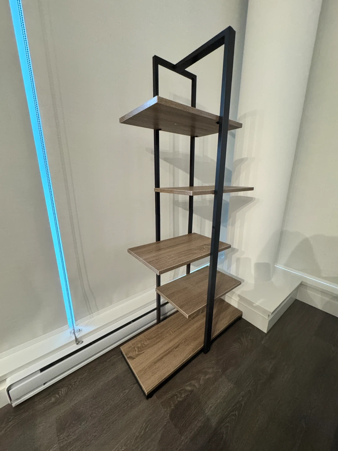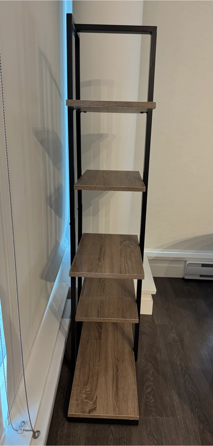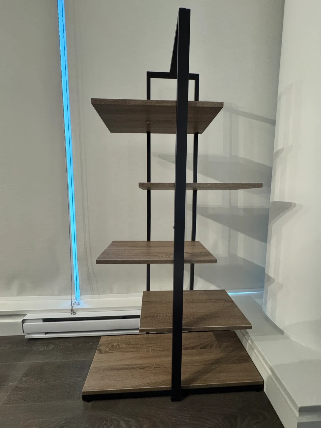 Stylish 5-tier bookshelf, perfect for adding storage and a touch of modern design to any room. It features a combination of staggered wood-look shelves and a black metal frame, offering a sturdy and attractive piece of furniture for your books, decor, or plants Pick up and Cash only ***Instructions with necessary tools included***