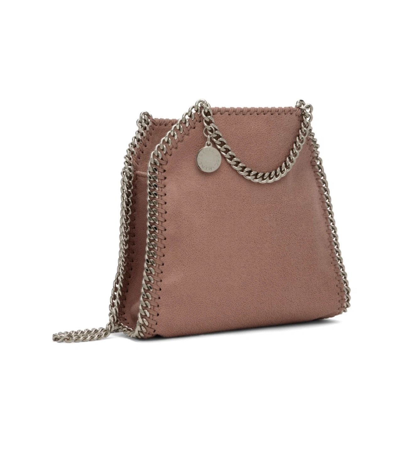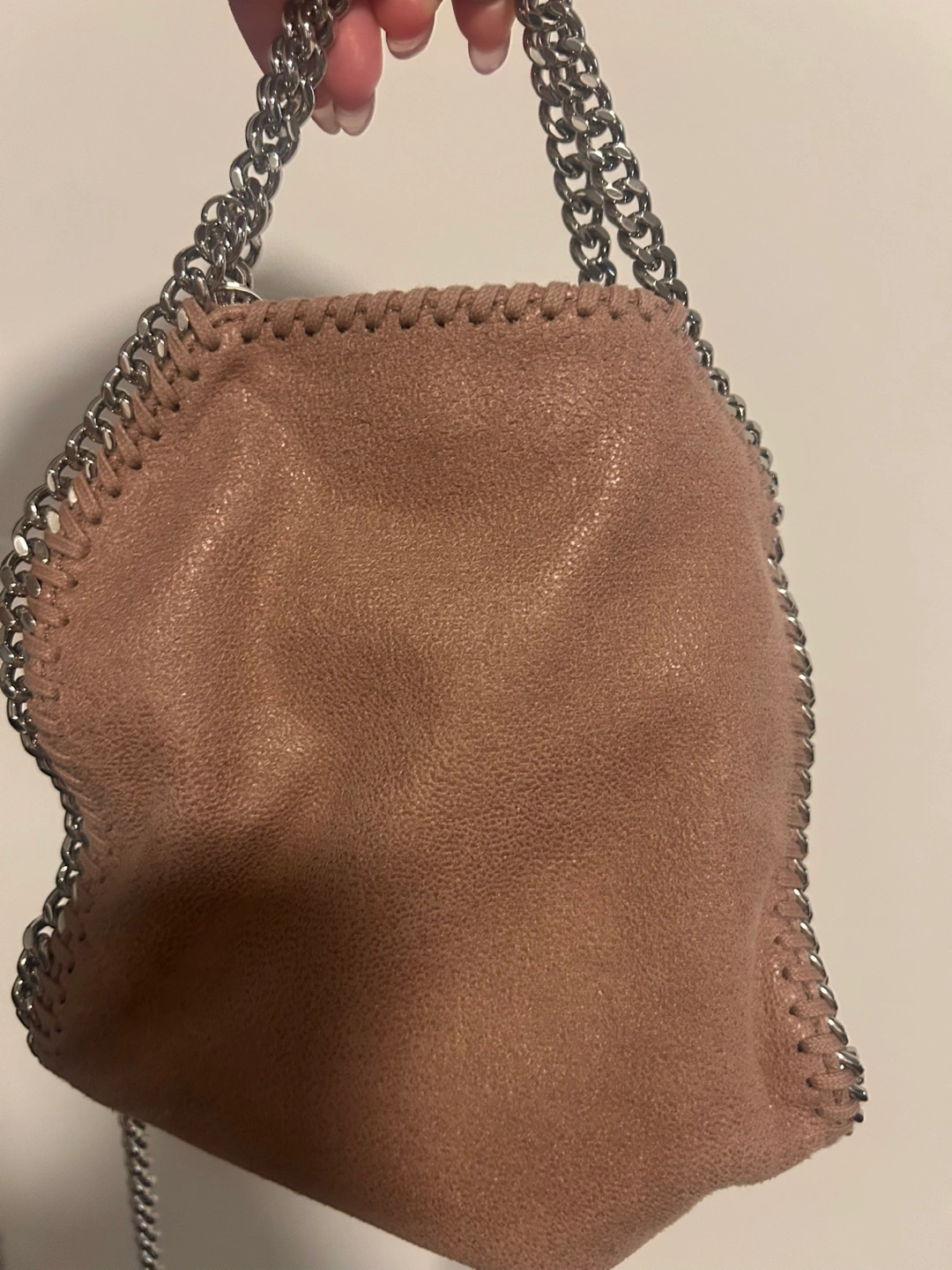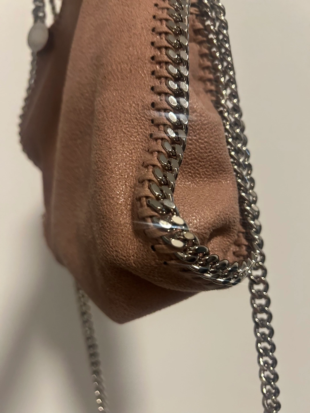 Adorable mini Falabella bag. Features iconic chain detailing. Dusty rose coloured suede. Silver-toned hardware. Small but roomy. New with dust bag